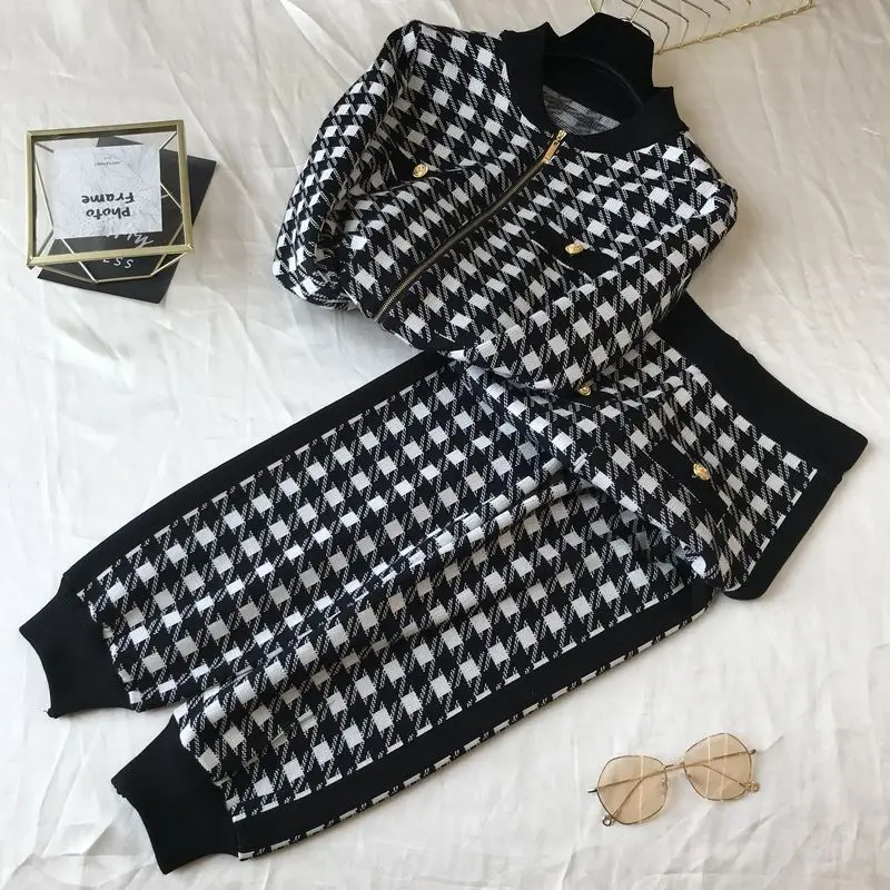 Комплект для отдыха с широкими штанинами и брюками-фонариками в клетку, женский модный осенне-зимний комплект из двух предметов, прямая куртка, спортивный костюм, теплое пальто