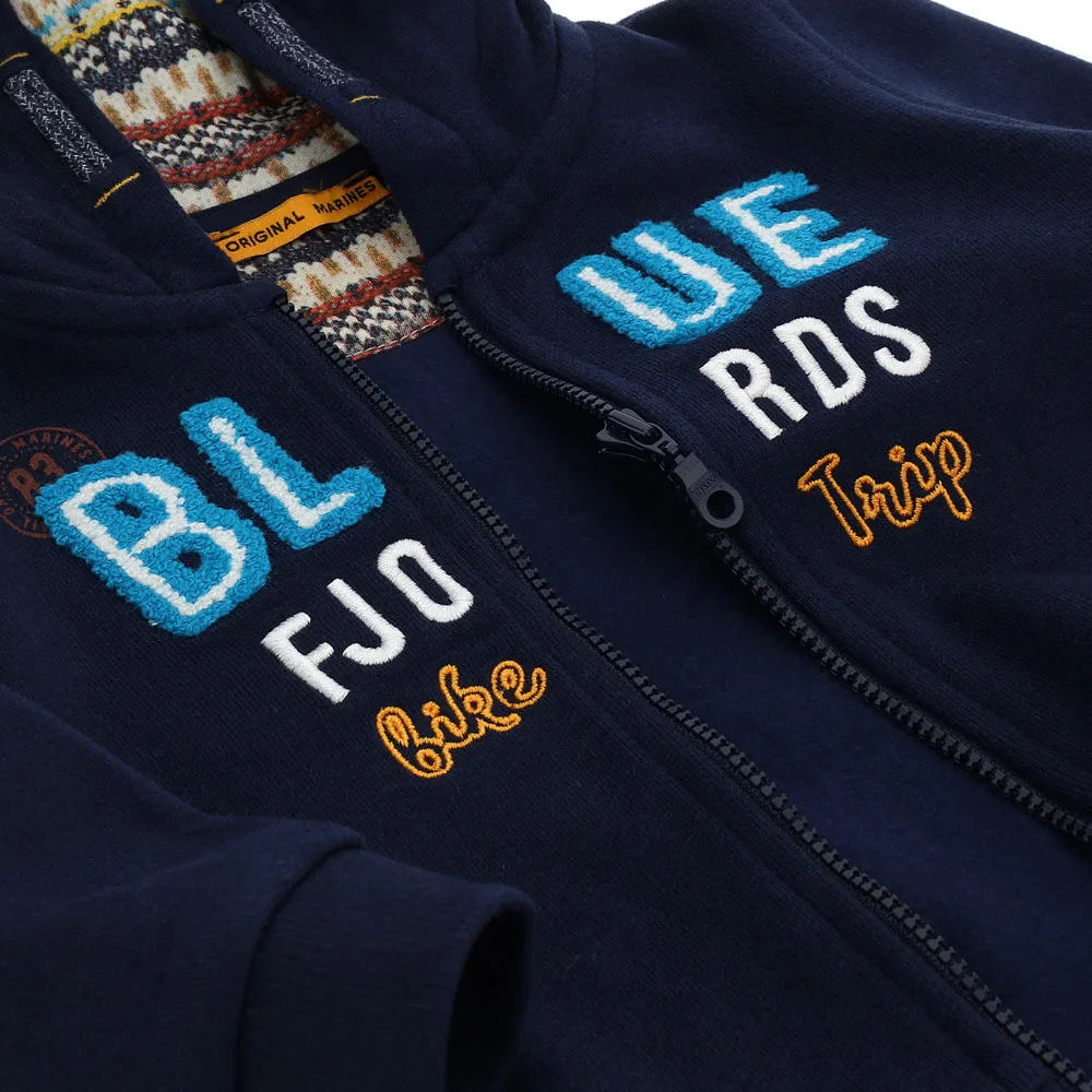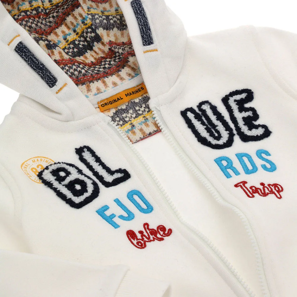 Толстовка на молнии для мальчиков в лаконичной белой расцветке. Имеет свободный крой - оверсайз, находящийся на пике популярности. Декор надписи выполнен технологии флокирование, и имеет объем. Подклад с этническими узорами присутствует в отделке глубокого капюшона. Выполнена из 100% хлопка, отличается теплотой.