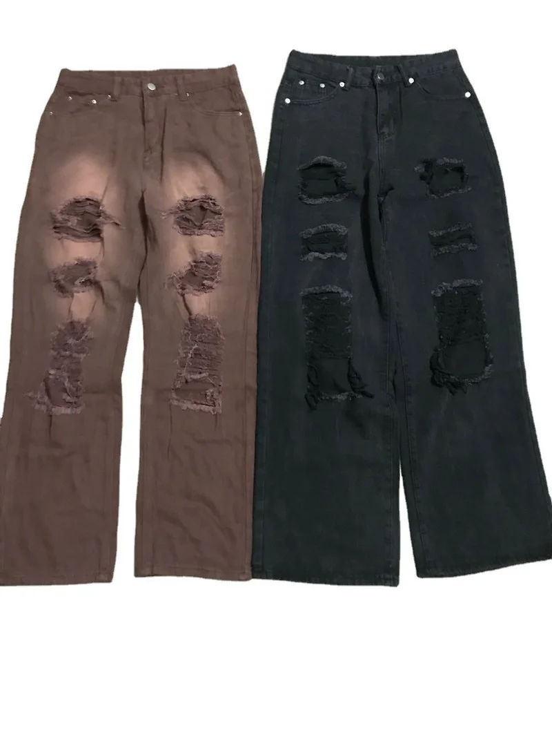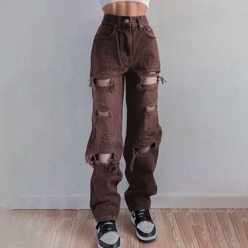 Джинсы женские рваные с завышенной талией, винтажные модные прямые штаны в стиле хип-хоп, с потертостями, с дырками, коричневые
