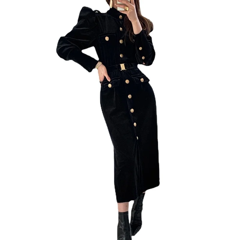 Женское бархатное платье с воротником-стойкой, однотонное черное вечерние бортное праздничное элегантное офисное платье в Корейском стиле, Осень-зима