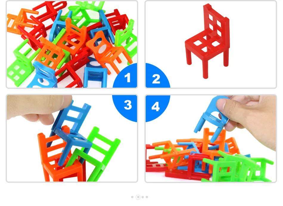 1. Изготовлен из экологически чистого пластика, нетоксичный, гладкая поверхность, безопасен для игр детей.2. Мини-размер, портативный, удобный для детей.3. Всего 18 стульев с 4 вида цветов, также подходит для 1-4 игроков, дети могут соревноваться с родителями или их друзьями.4. Правило игры: самая высокая стопка стульев без падения-это победитель, тот, кто проигрывает игру.5. Игра может улучшить координацию детей, упражнения и улучшить их баланс навыков и мышления логистики.
