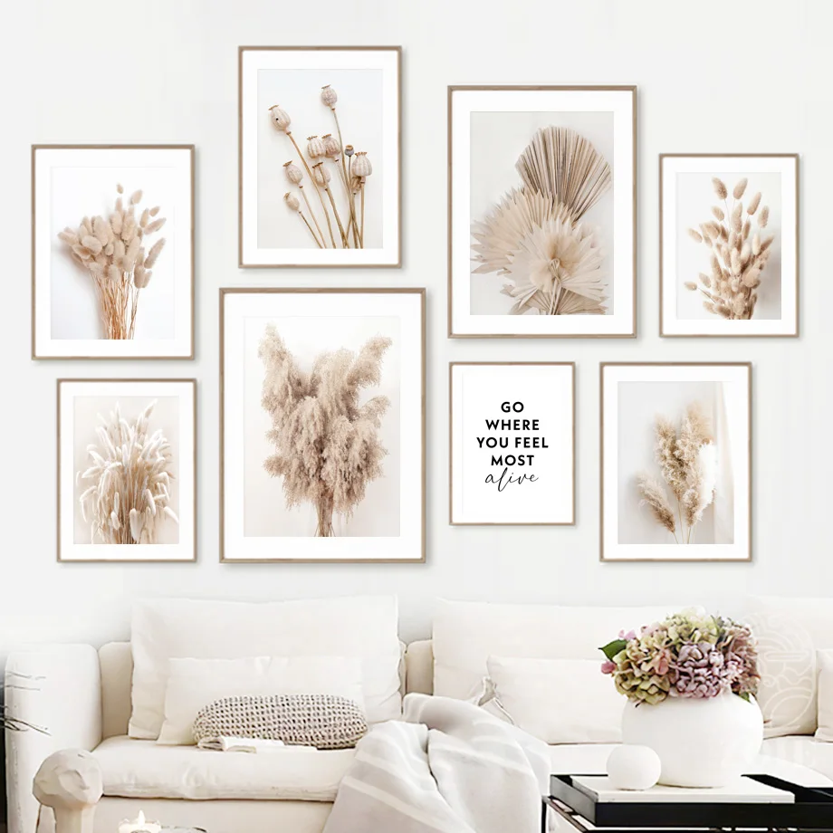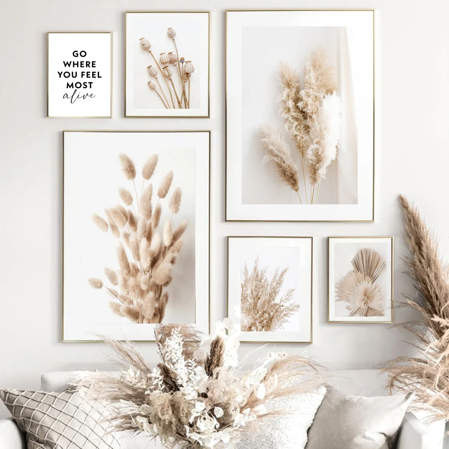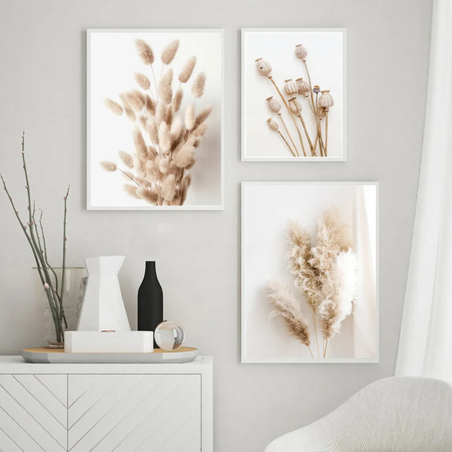 Настенная картина бежевого кролика, хвоста, травы, тростника, цветов, листьев, холст, скандинавские постеры и принты, настенные картины для декора гостиной