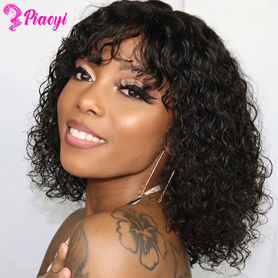 Парик Короткий вьющийся с челкой, перуанские волнистые натуральные волосы, без клея, машинные