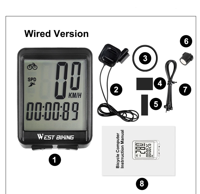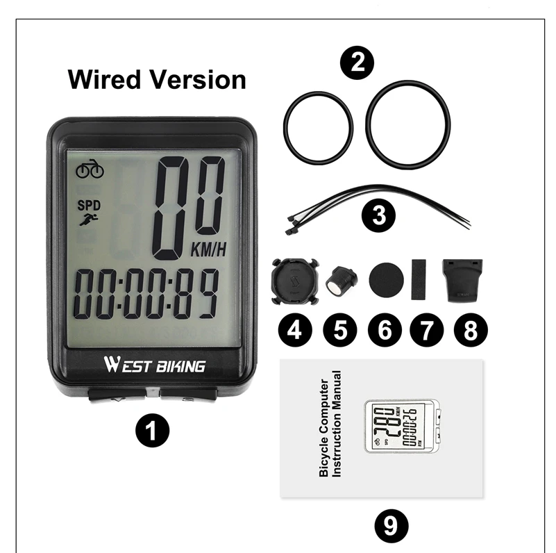 1. Велосипедный компьютер 2. Нейлоновые ремни * 7 3. Поглощающая вибрацию губчатая прокладка4. Резиновая петля 5. Проводная пусковая установка 6. Поглощающая вибрацию губчатая прокладка7. Кнопочный элемент 8. Сильный магнит 9. Инструкция по английской версии