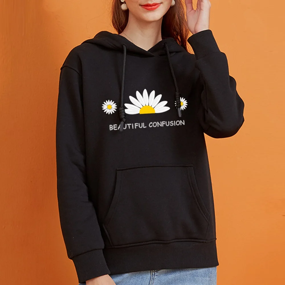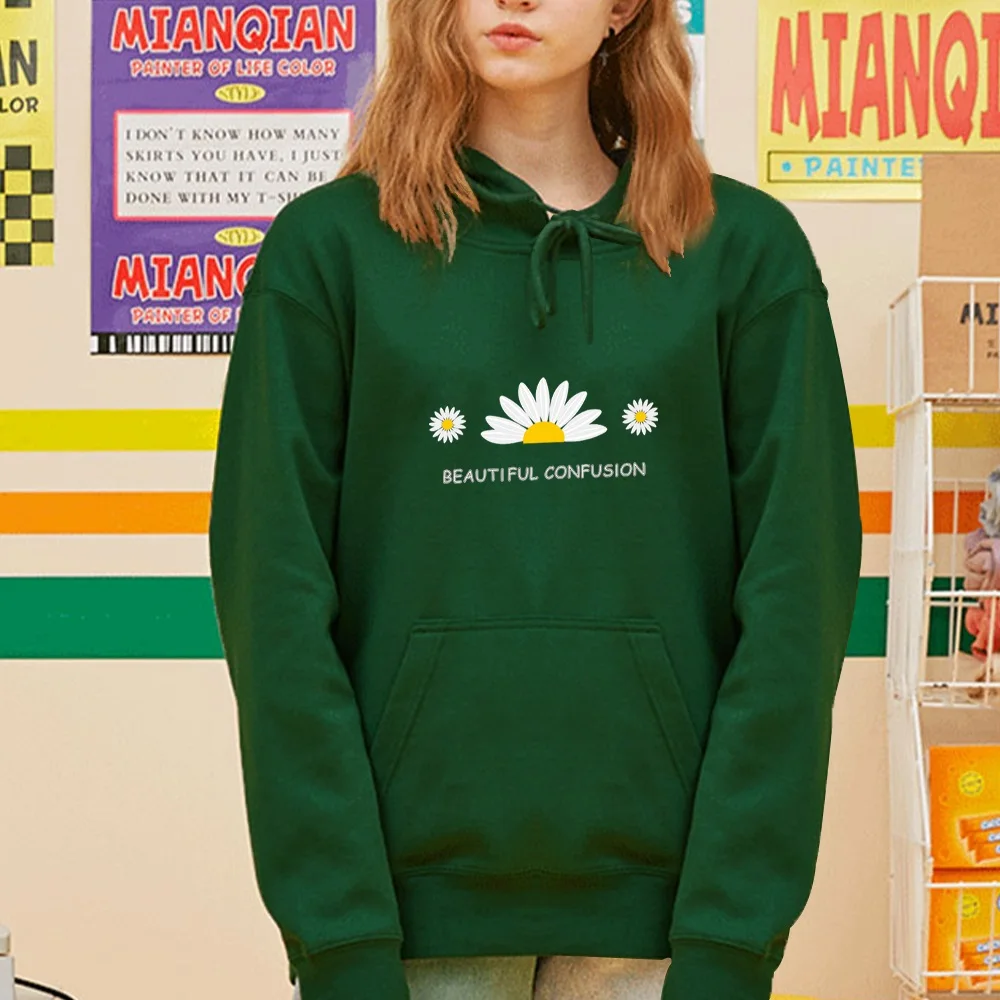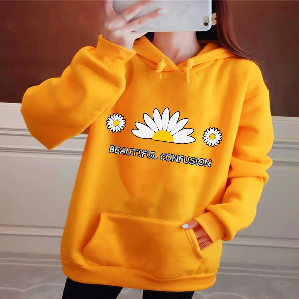 Женские толстовки, свитшот, осенние женские Топы с длинным рукавом и принтом маргариток, толстовка с капюшоном в стиле Харадзюку, Свободный свитшот с карманами, пуловер для девочек