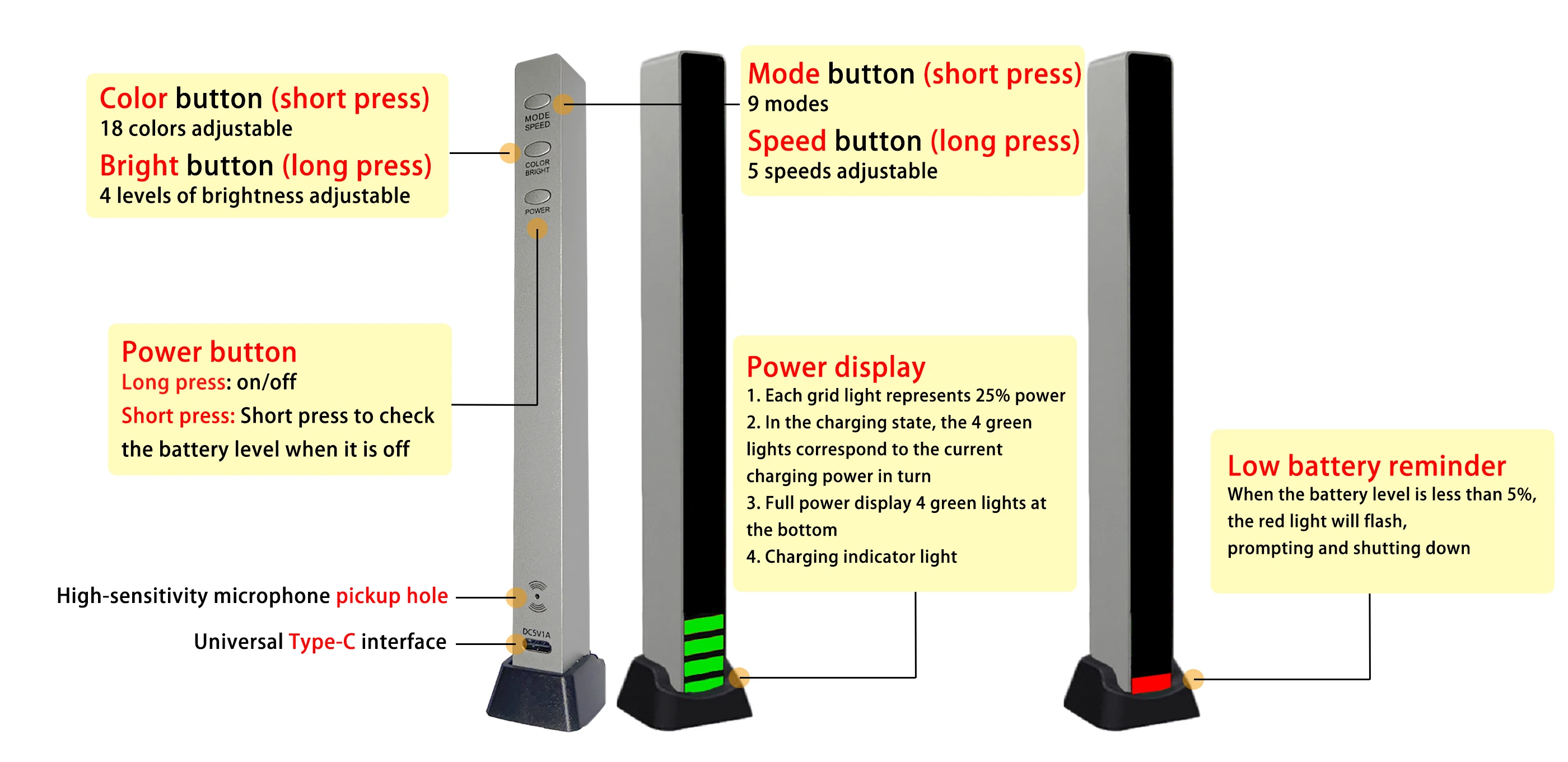 ● Кнопка «режим/скорость»: короткое нажатие, чтобы включить режим «Белый»-выбор режима; Длительное нажатие, чтобы включить красный-Выберите 5 скоростей● Цвет/яркий ключ: короткое нажатие, чтобы включить белый-Выберите цвет; Длинное нажатие, чтобы включить зеленый-Выберите 4 уровня яркости● Нажмите две кнопки одновременно: Нажмите одновременно, чтобы включить синий-чтобы узнать спектр шума окружающей среды● Нажмите и удерживайте цвет одновременно при включении питания: Введите режим настройки усиления● Включение питания (только для модели аккумулятора): Нажмите кнопку цвета после выключения питания● Выключение (только Модель аккумулятора): Держите лицо вниз в течение 3 секундПосылка включает в себя: