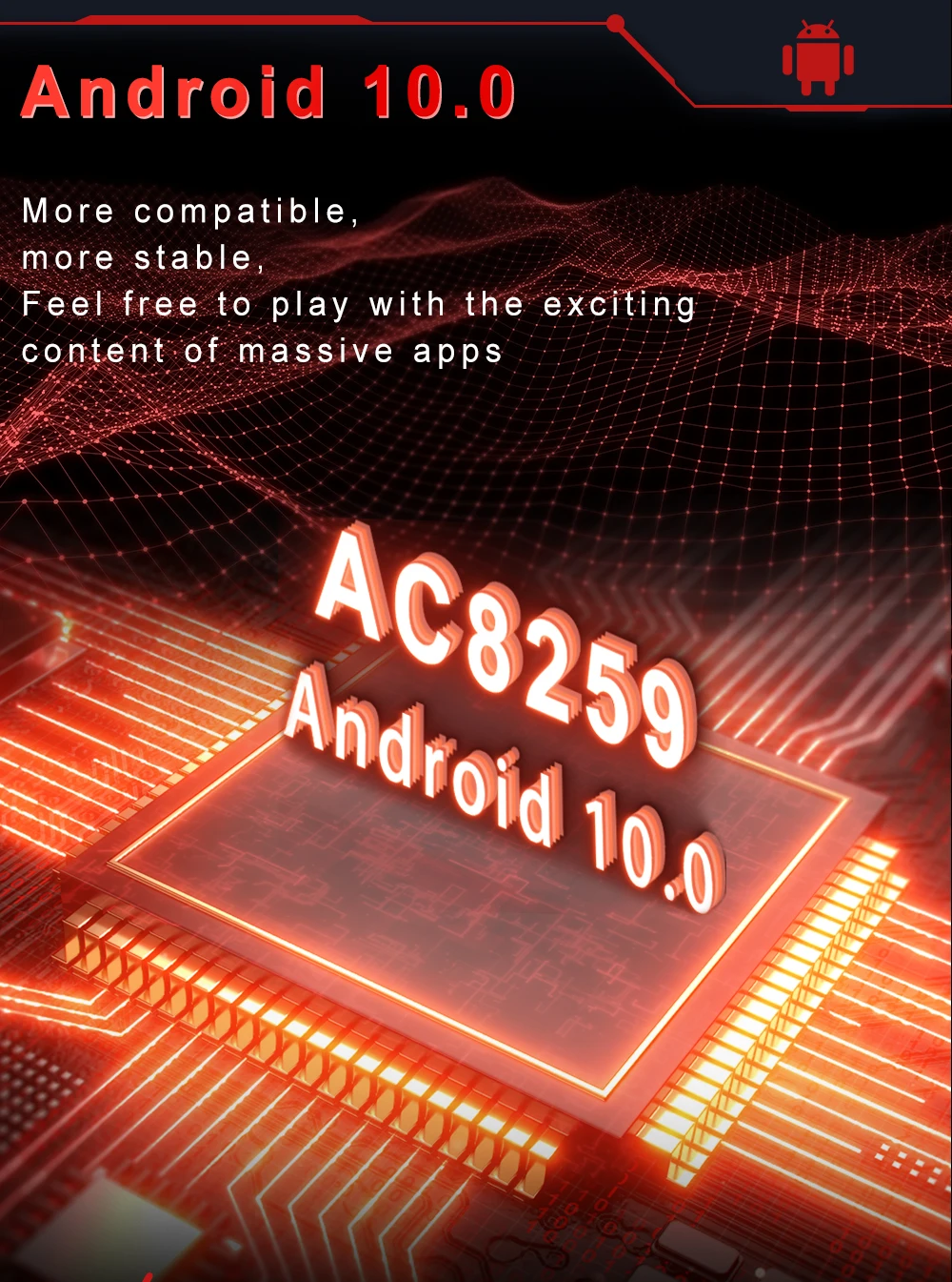 Система:Android 10,0Центральный блок обработки:AC8259Набор микросхем: 8 ядерСкорость работы: 2,5 ГГцЭкран Размеры: 10,1''Разрешение экрана: 1024*600Оперативная память: 1/2/4/8 ГБ (Оперативная память) + 16 GB/32/64/128 ГБ (Встроенная память)Выходная мощность: 4*45 ВтУсилитель мощности: ST7850Радиочип: NXP6856Звуковой эффект: ADI/HI-Res: 192 кГц/32 битИнтеллектуальный Голос: Встроенный стандартРазделенный экран: ПоддержкаCarplay: беспроводной + проводнойВыход Android: проводнойАвтомобиль Android: проводнойФункция управления рулем: ПоддержкаВерсия Bluetooth: 5,0Радиочастотный диапазон:FM/AM/RDSКарта: встроенная автономная карта (требуется загрузка через Интернет)WIFI: поддержкаИнтернет:Карта 4GUSB: двойной USB интерфейсDSP: ПоддержкаAHD Камера: ПоддержкаOBD2: ПоддержкаDAB +: ПоддержкаВидеорегистратор на жестком диске: ПоддержкаСистема контроля давления в шинах: ПоддержкаВидеовыход: ПоддержкаСсылка на телефон: поддержкаНавигационная карта:GPS/BDS/GlonsВнешний микрофон: ПоддержкаЯзыки: китайский/английский/французский/итальянский/Корейский/японский/арабский/испанский/португальский/русский/Турецкий/Вьетнамский/Иврит/Польский/немецкий и т. Д.