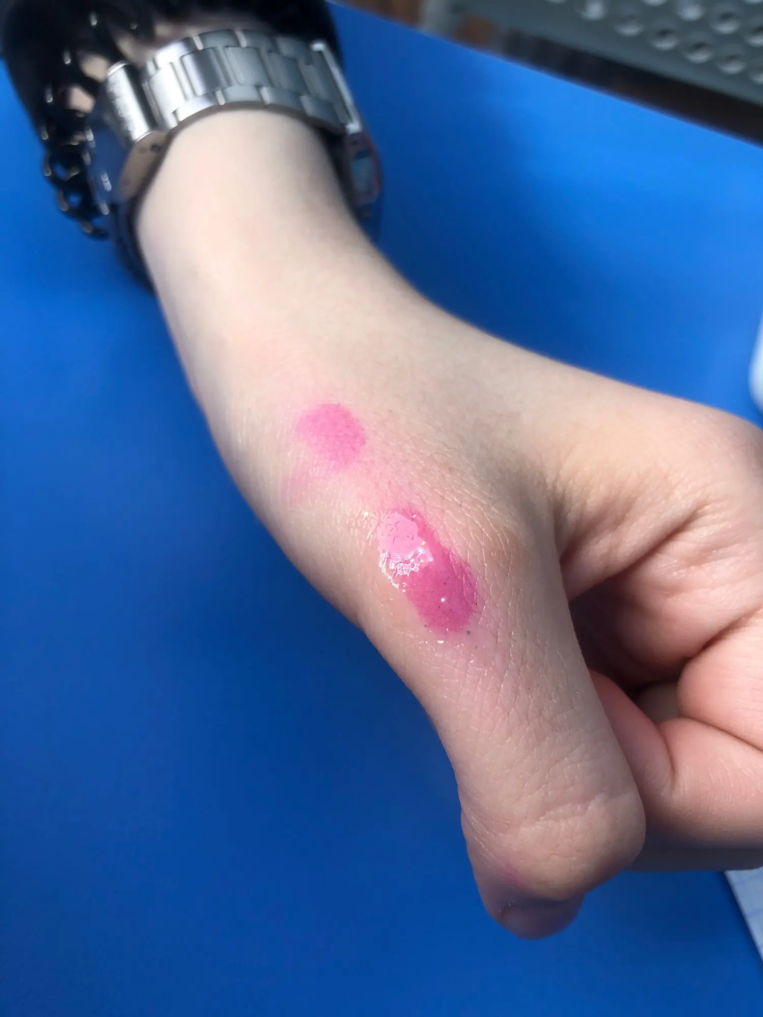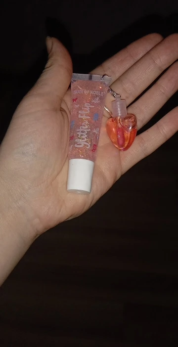 очень понравился блеск. блестки попадают на губы, очень красиво. в маленьком флаконе вроде масла для губ. продукт отлично увлажняет, приятен на губах.