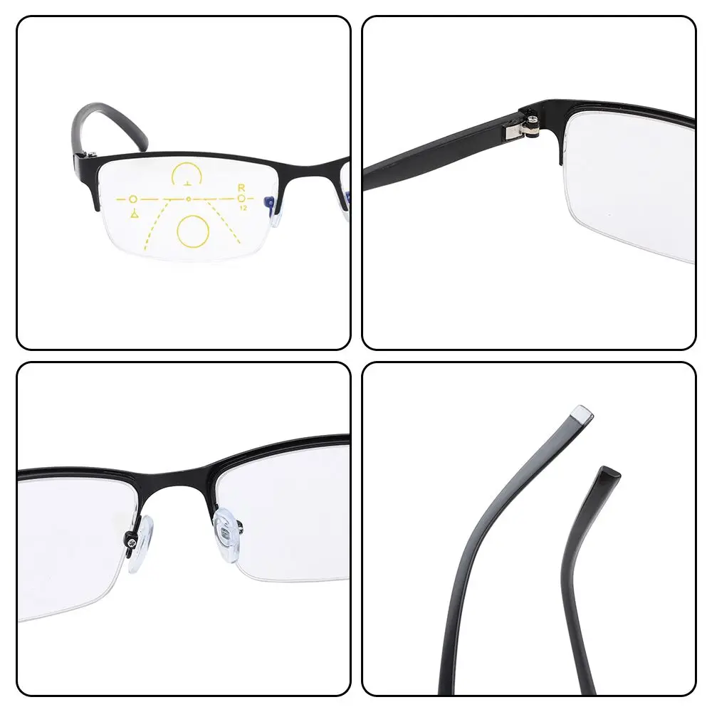 Тип: Прогрессивные очки для чтения с мультифокусом Стиль: Модный, классический Материал линз: смола Технология линз: блокирующий синий светильник, антибликовый, УФ-защита, прогрессивный мультифокус Сила увеличения: сила 1.0x ~ 4.0x Материал оправы: металл Цвет: черный, темно-черный -Какие прогрессивные Мультифокальные очки для чтения? Асимптотические многофокальные очки являются верхней оптической областью линзы, используемой для того, чтобы смотреть далеко, а нижняя оптическая область, используемая для просмотра рядом. Степень середины постепенно меняется, что используется для просмотра промежуточной области. Большинство людей, которые носят прогрессивные многофокальные очки, нуждаются в около недели адаптации, но период адаптации варьируется от человека к человеку; Они ходят медленнее, когда у них головокружение. При спуске вниз, пожалуйста, опустите очки и используйте верхнюю область. Вы будете чувствовать себя в безопасности и комфортно. Размер продукта: Общая ширина: 140 мм (5,51 дюйма) Ширина линз: 54 мм (2,13 дюйма) Высота линз: 34 мм (1,34 дюйма) Ширина носоупора: 21 мм (0,83 дюйма) Длина дужек: 143 мм (5,63 дюйма) Вес: 18,8 г (0,66 унций) Посылка включает в себя: 1 x очки для чтения Примечание: 1. Есть разница в 2-3% в соответствии с ручными измерениями. Пожалуйста, внимательно проверьте размер перед покупкой товара. 2. Пожалуйста, обратите внимание на то, что в светильник разница в цвете, это может быть связано с положением источника светильник и с настройками экрана.