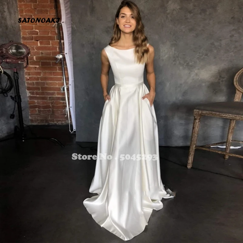 Простое свадебное платье А-силуэта без рукавов с открытой спиной ат...