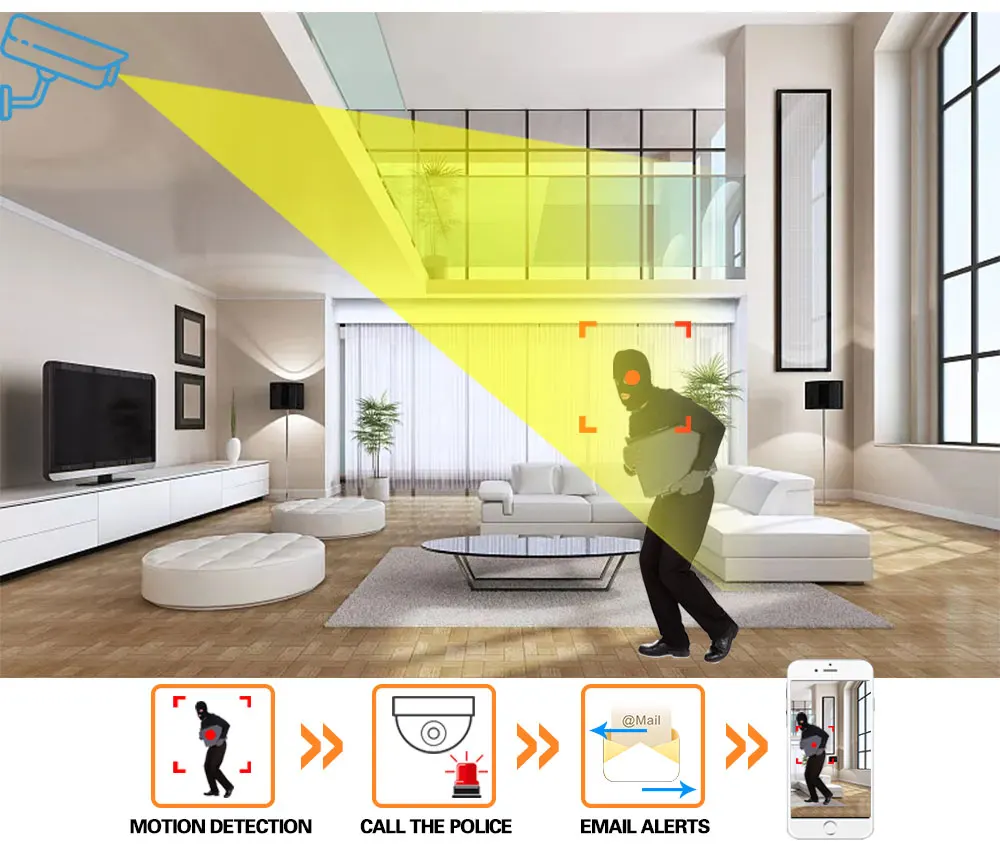 Можно настроить область, которую вы хотите контролировать, когда она срабатывает, она отправит сообщение на вашу электронную почту, вы можете получить информацию из первых рук, независимо от того, когда и где вы находитесь.