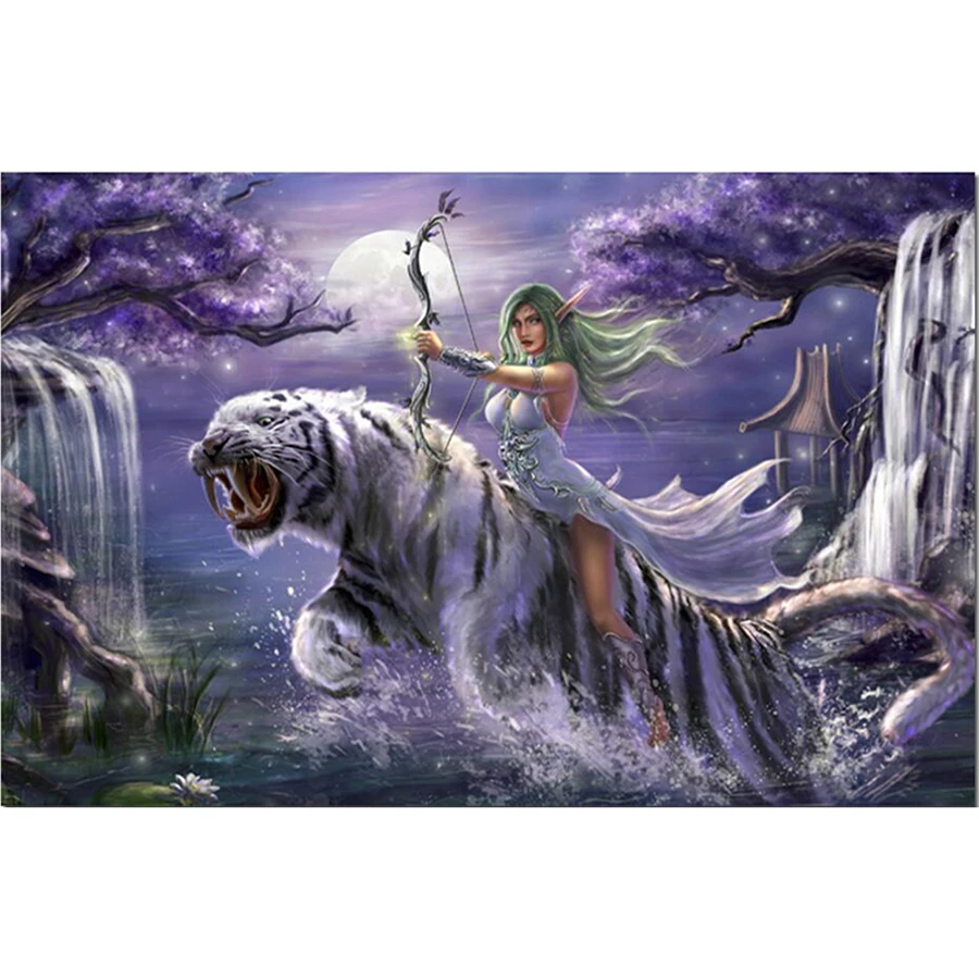 5D алмазная живопись Фантазия девушка зеленые волосы эльф лук белый тигр Стразы DIY Алмазная вышивка крестиком Декор Большой