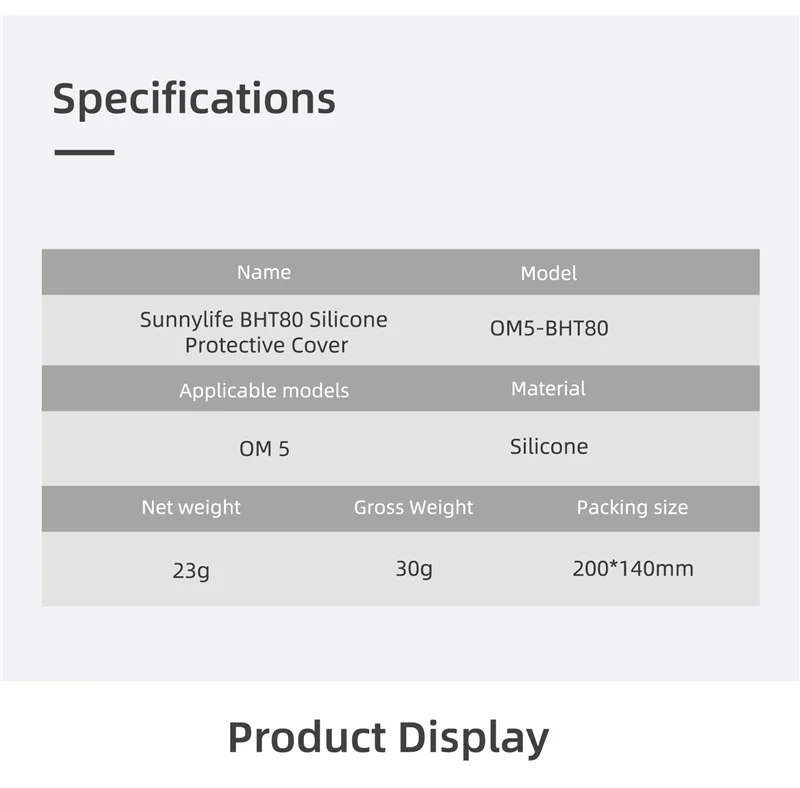Особенности:-Идеально подходит для OM 5 и не влияет на соединительный ремешок и штатив.-Мягкий силиконовый материал. Устойчивый к царапинам, ударопрочный и защитный.-Храните OM5 с силиконовым чехлом в оригинальной сумке и сумке Sunnylife B74.-Нескользящий и удобный дизайн в полоску на задней части чехла. Характеристики:Название: силиконовый защитный чехол Sunnylife BHT80Модель: OM5-BHT80Применимые модели: OM 5Материал: силиконВес нетто: 23 гВес брутто: 30 гРазмер упаковки: 200*140 мм