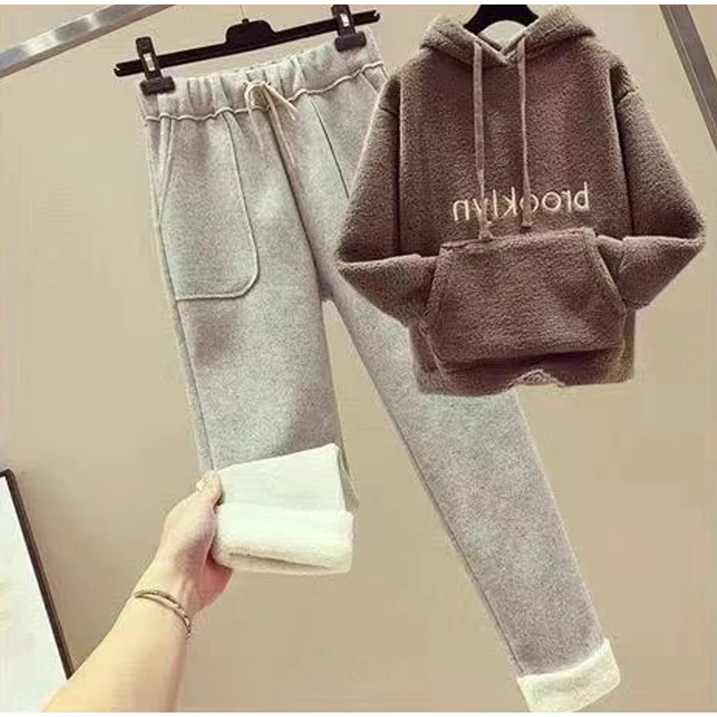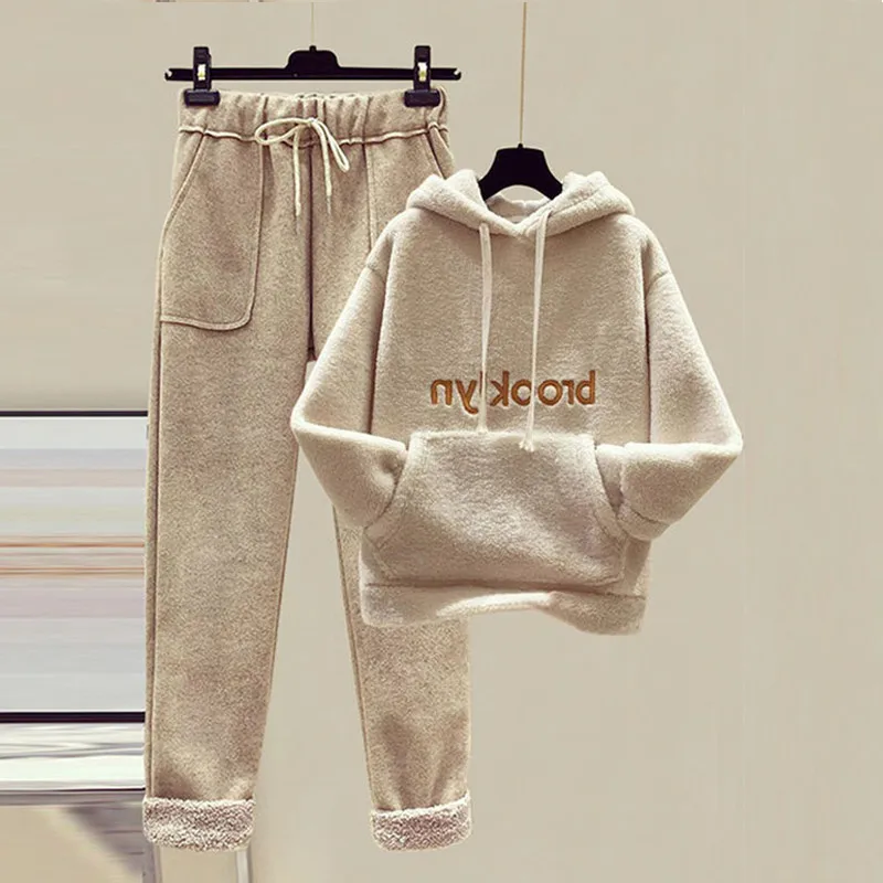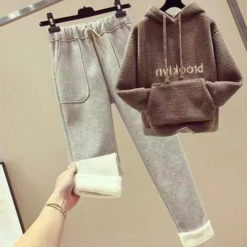Женский осенне-зимний флисовый спортивный костюм с капюшоном и надписью, свитшот с карманами на шнурке, брюки 2021, повседневный Женский комплект из двух предметов