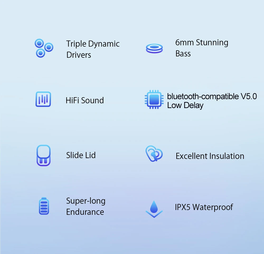 Тройные динамические драйверыПотрясающие басы 6 ммHifi звукBluetooth-comaptible V5. 0 низкая задержкаСкользящая крышкаОтличная изоляцияСупер-длинная выносливостьIPX5 Водонепроницаемый