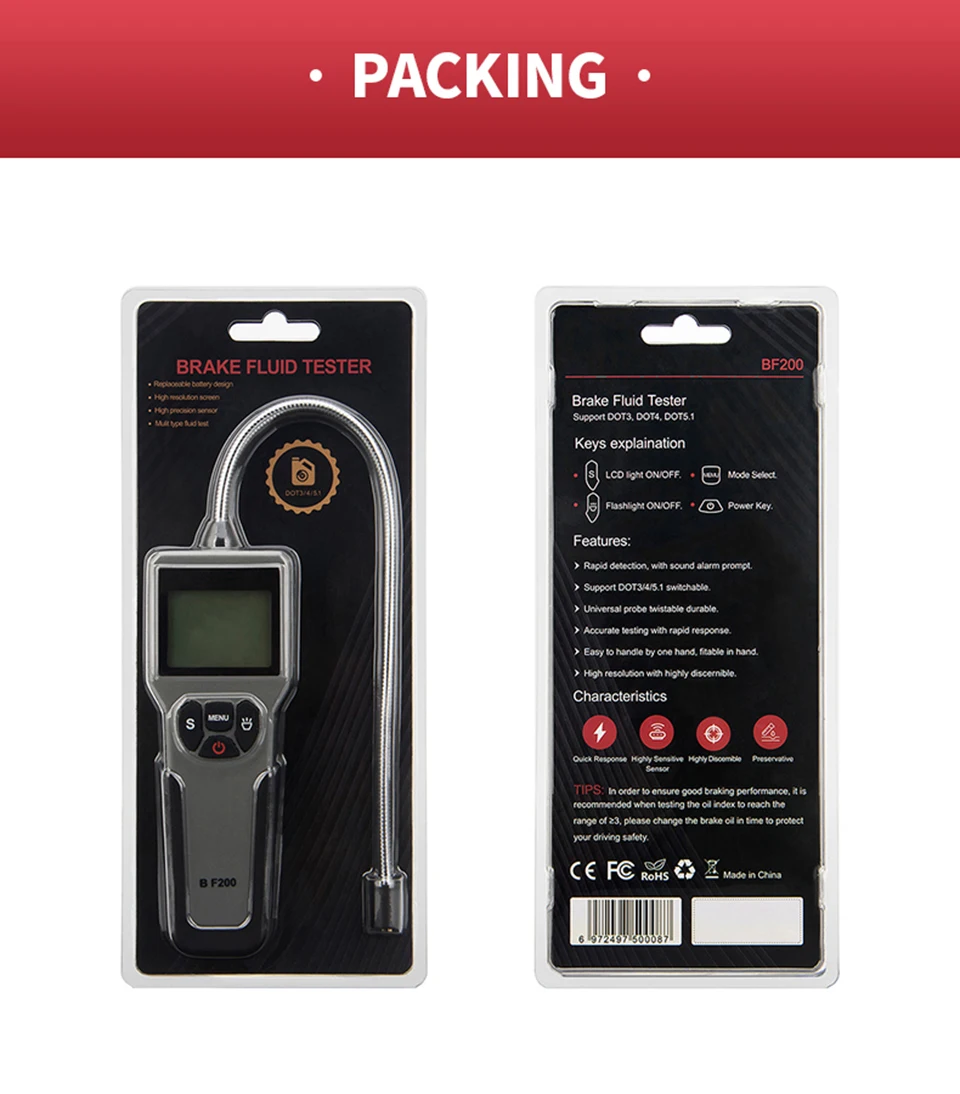【Область применения 】 --- автомобильный детектор тормозной жидкости обычно подходит для большинства транспортных средств. Проверьте состояние здоровья тормозной жидкости DOT-3, DOT-4, DOT-5.1, а также большинства синтетических тормозных жидкостей s. Это чрезвычайно удобно для личного использования и широко применяется в отдельных мастерских, ремонтных заводов и дилерских мастерских.【Точный тест и универсальный probe】 --- высокочувствительный и точный зонд, может быстро и точно обнаруживать DOT-3, DOT-4, DOT-5.1 Тормозная жидкость и получила результат за считанные секунды. Зонд гусиная шея обеспечивает гибкость в обнаружении, что делает процесс обнаружения более эластичным и эффективным. Верх зонда со вспышкой светильник, вы можете наблюдать цвет тормозной жидкости при необходимости.【Легкое мгновенное считывание и Alarm】 --- Высокочувствительный зонд + экран с высоким разрешением + звуковой сигнал, мгновенный результат отображения, большой дисплей с подсветкой, легкое и четкое чтение на солнце или в ночное время. Никогда не ограничиваются окружающей средой. Как только Тормозная жидкость подаст слишком много воды, это напомнит вам, что вам нужно изменить тормозную жидкость.【Высокое качество и эргономичный дизайн --- тело с хорошей текстурой, компактный размер, идеальное ощущение руки. Гусиная шея поверхностные масла и стойкие к окислению, не легко коррозионные. Простая панель управления, проста в использовании. Зонд сверху со вспышкой светильник, вы можете наблюдать цвет тормозной жидкости при необходимости.