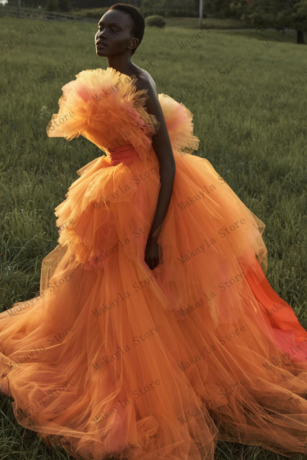 Очаровательные оранжевые пышные фатиновые элегантные женские длинные вечерние платья с оборками на заказ