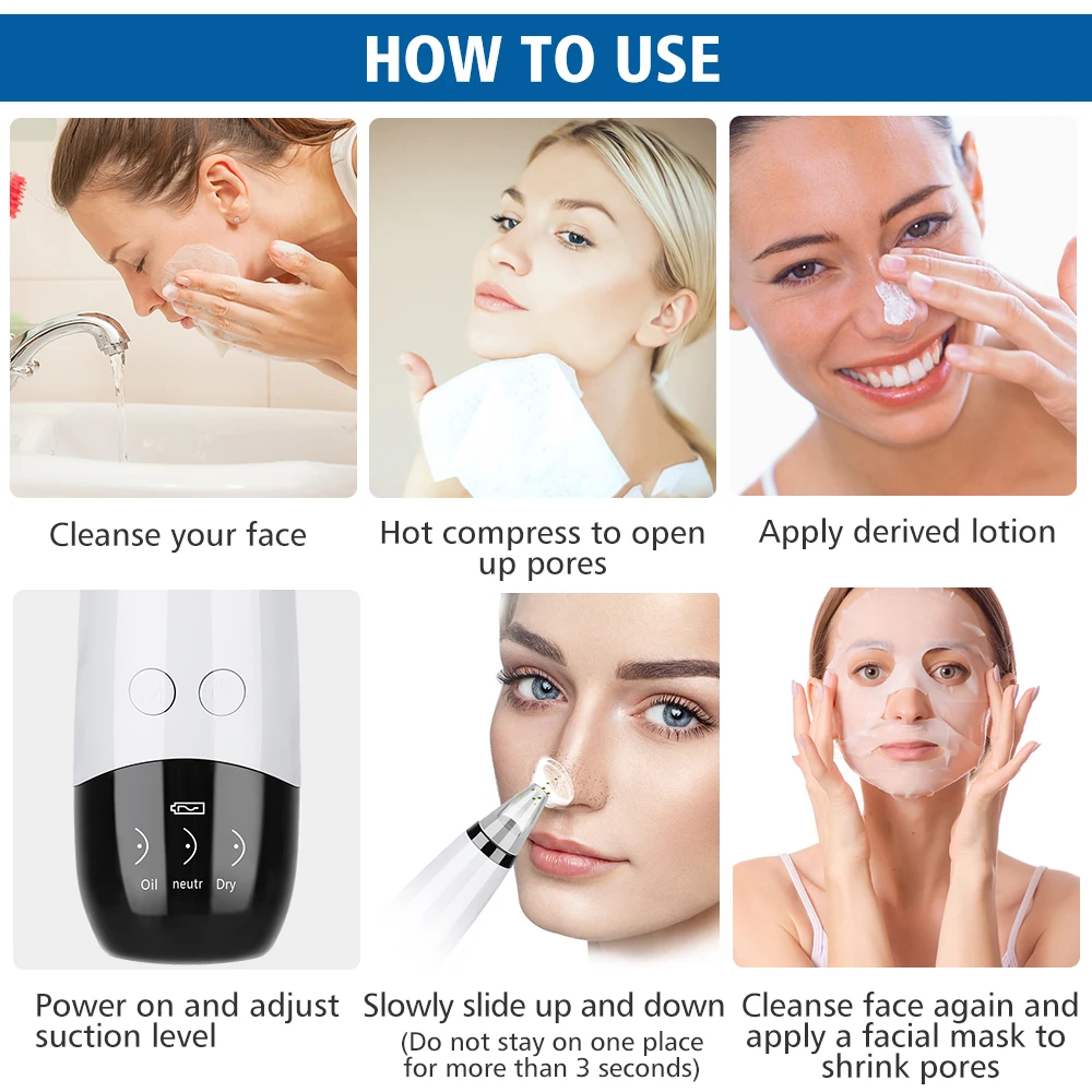 Очиститель пор для лица, удаление угрей, вакуумный всасывающий очиститель, поры, акне, экстрактор прыщей, устройство для удаления, уход за кожей, косметический инструмент, домашний спа-салонОсобенности1.[Безопасный и эффективный] используется инновационная усовершенствованная технология вакуумного поглощения для супер сильного всасывания, чтобы легко высасывать черные, белые, омертвевшую кожу, остатки макияжа, прыщи и прыщи, не повреждая вашу кожу, не раздражает и безболезненно избегает побочных эффектов.2.[многофункциональное применение] 3 регулируемых уровня всасывания и 6 сменных всасывающих головок для бесплатной регулировки, широко подходят для различных типов кожи и работают на различных областях кожи, полностью отвечают вашим требованиям по очистка пор.3.[простота в эксплуатации] Управление одной кнопкой, вы можете удобно включать/выключать и переключать этапы всасывания, удобно работать для мгновенного удовольствия.4.[четкая индикация] светодиодный дисплей высокой четкости обеспечивает прямую индикацию уровней всасывания, остается заряд батареи и рабочее состояние для монитора в реальном времени, чтобы подготовиться к следующему использованию.5.[Стабильная производительность питания] Встроенный перезаряжаемый полимерный аккумулятор 380 мАч может заряжаться через usb-зарядку, вы можете практически получить доступ к блоку питания через ПК, планшетный компьютер, адаптер, внешний аккумулятор и другие устройства с поддержкой USB.6.[надежное качество] эргономичный Обтекаемый корпус и высококачественный АБС-материал обеспечивают удобные удерживающие ручки, долговечные для длительного использования.7.[компактный размер] Легкий и портативный дизайн, подходит для дома и путешествий с переносным бризом.Технические характеристикиМатериал: АБС-пластикЦвет корпуса: белыйРабочее напряжение: 5 ВПрочность всасывания: 6262 кПаНапряжение зарядки: 5 ВВходная мощность: 2,5 WНоминальная Напряжение: 3,7 VТип батареи: перезаряжаемый полимерный аккумулятор 380 мАчИсточник питания: зарядка через USBВремя зарядки: около 90 минВес нетто: 125 гПожалуйста, обратите внимание:Продукт не подходит для следующих людей:1. У людей с заболеваниями кожи, аллергией на кожу, дерматитом и тяжелыми солнечными ожогами.2. У людей с травмой кожи, экземой и отеками.3. Люди, которые только что оправились от операции.4. Людям с физическими, сенсорными или умственными проблемами предлагается использовать под руководством хранителя.Посылка включает в себя:1 * вакуумный Электрический Очиститель для удаления угрей (основной блок)6 * сменная всасывающая головка1 * USB кабель1 * Руководство пользователя