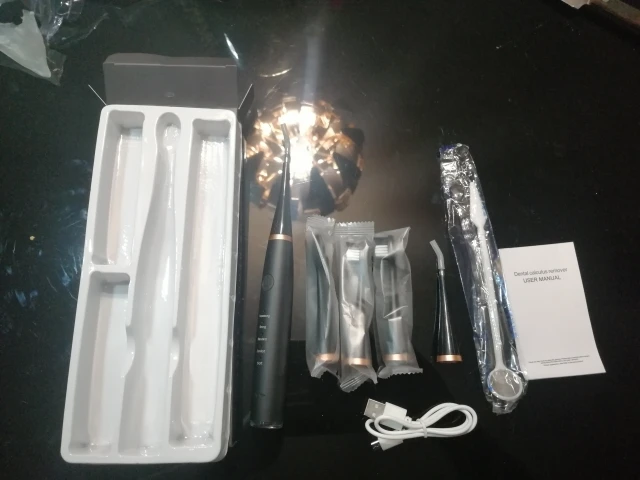 4. НесколькоАксессуары-три сменные насадки для зубной щетки используется для ежедневного использованияОчистка зубов и две высококачественные легированные стали медицинского классаСменные головки можно использовать для удаления зубного камня, пятен чая и дымаПятна.