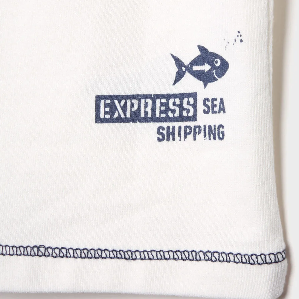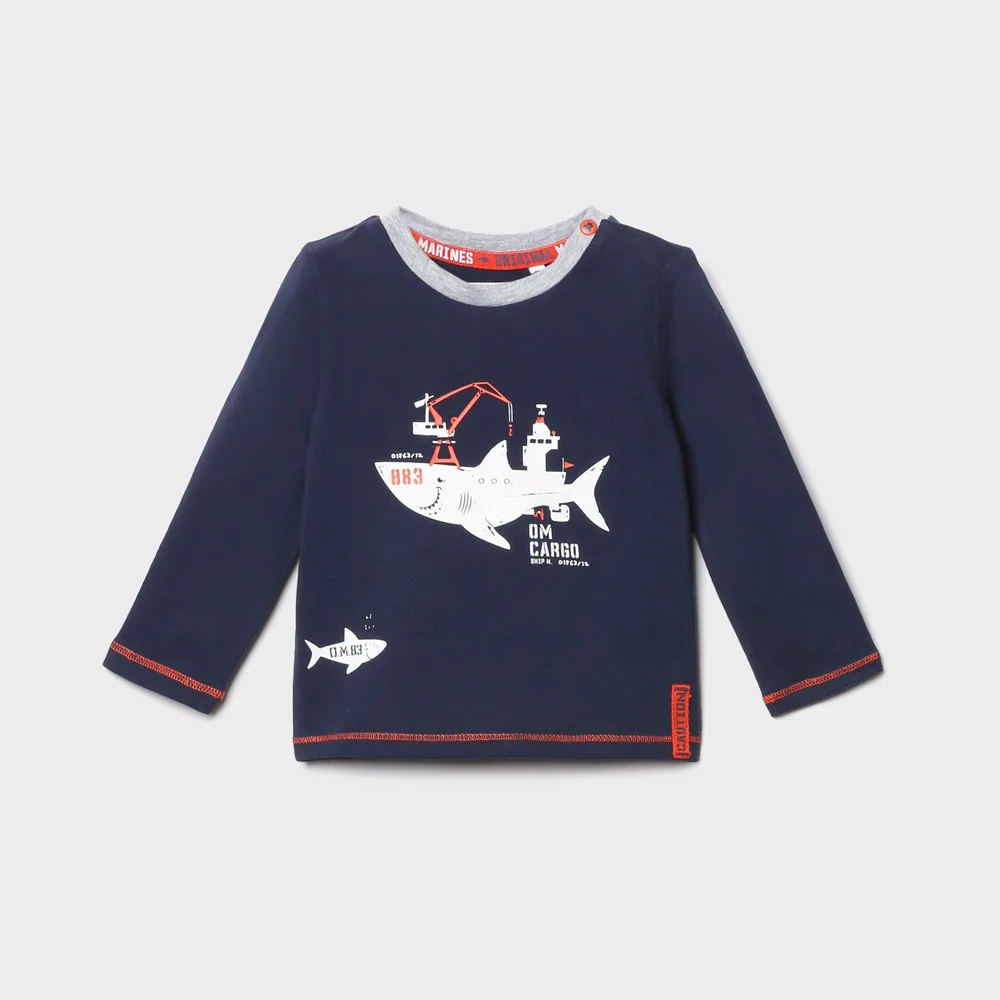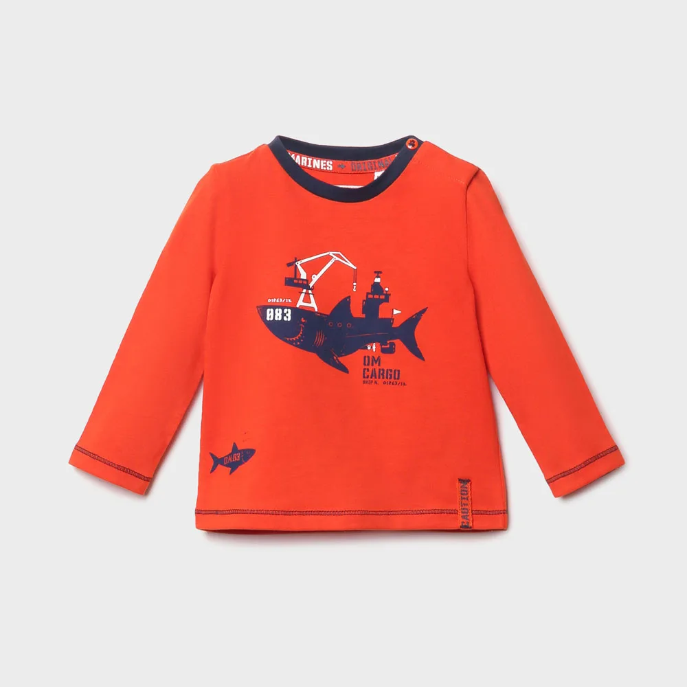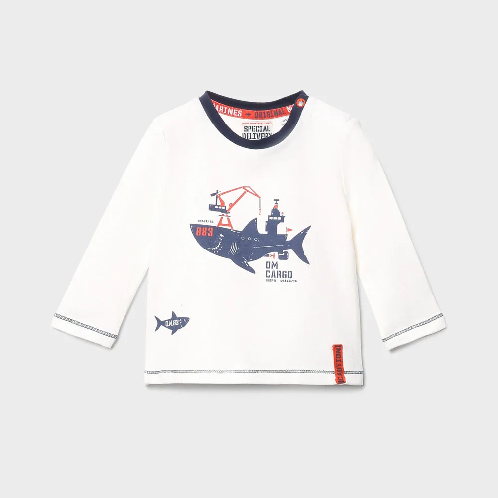 Лонгслив для мальчиков в универсальном оттенке. Материал полностью натурален – 100% хлопок. Ткань мягкая, приятная. Декор - рисунок улыбающейся акулы, выполнено безопасными красками. Строчка ярко-синяя, двойная. Рукава длинные, без декора. Застегивается на планку сбоку от горловины с оранжевой клепкой.