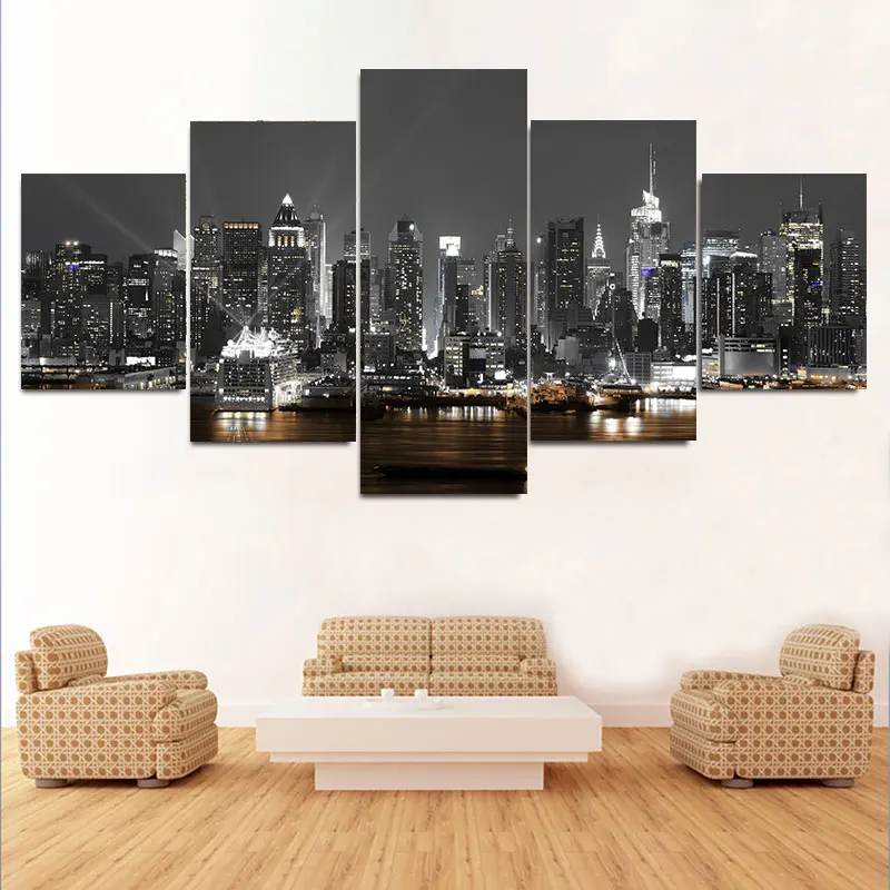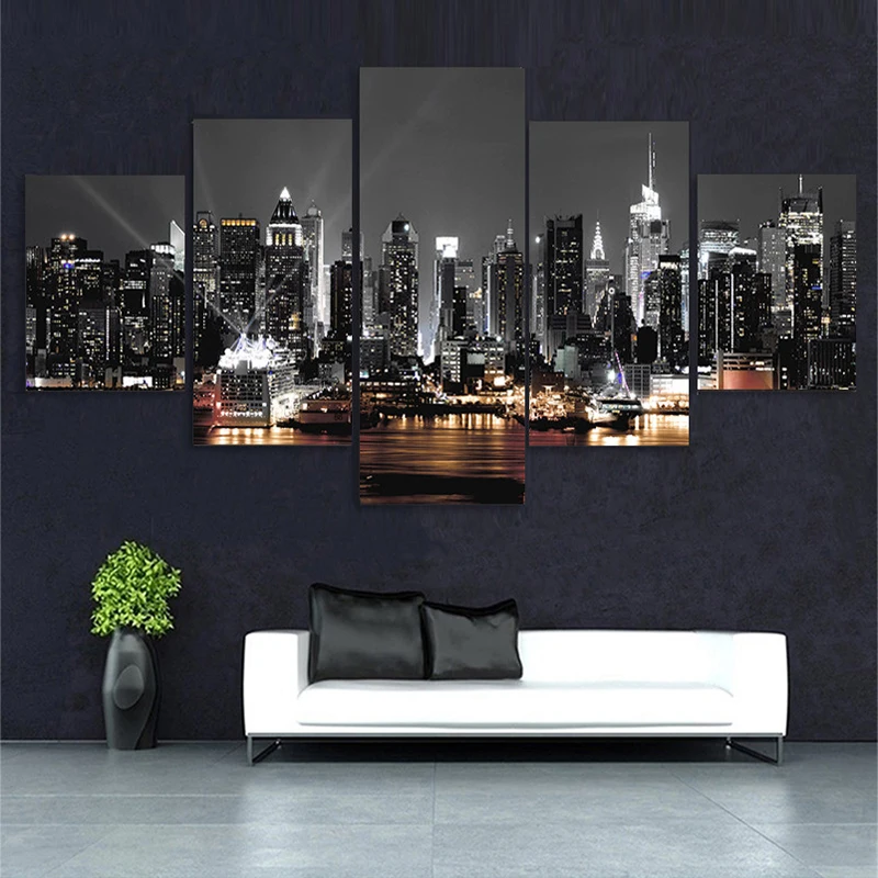 5 шт., Картина на холсте, настенная живопись, Нью-Йорк, строительство, пейзаж, фотографии, печать, ночной вид, пейзаж, постер, домашний декор