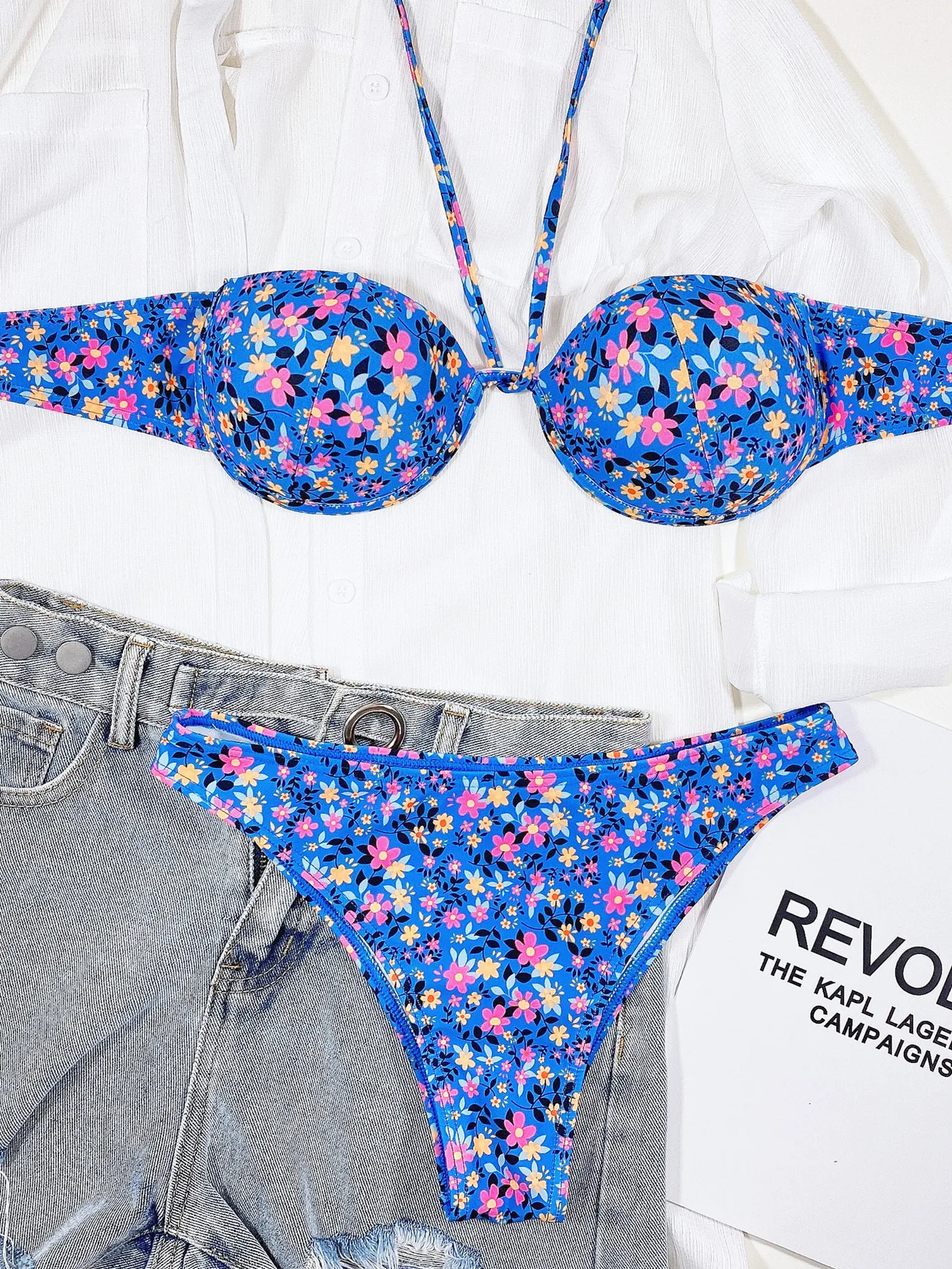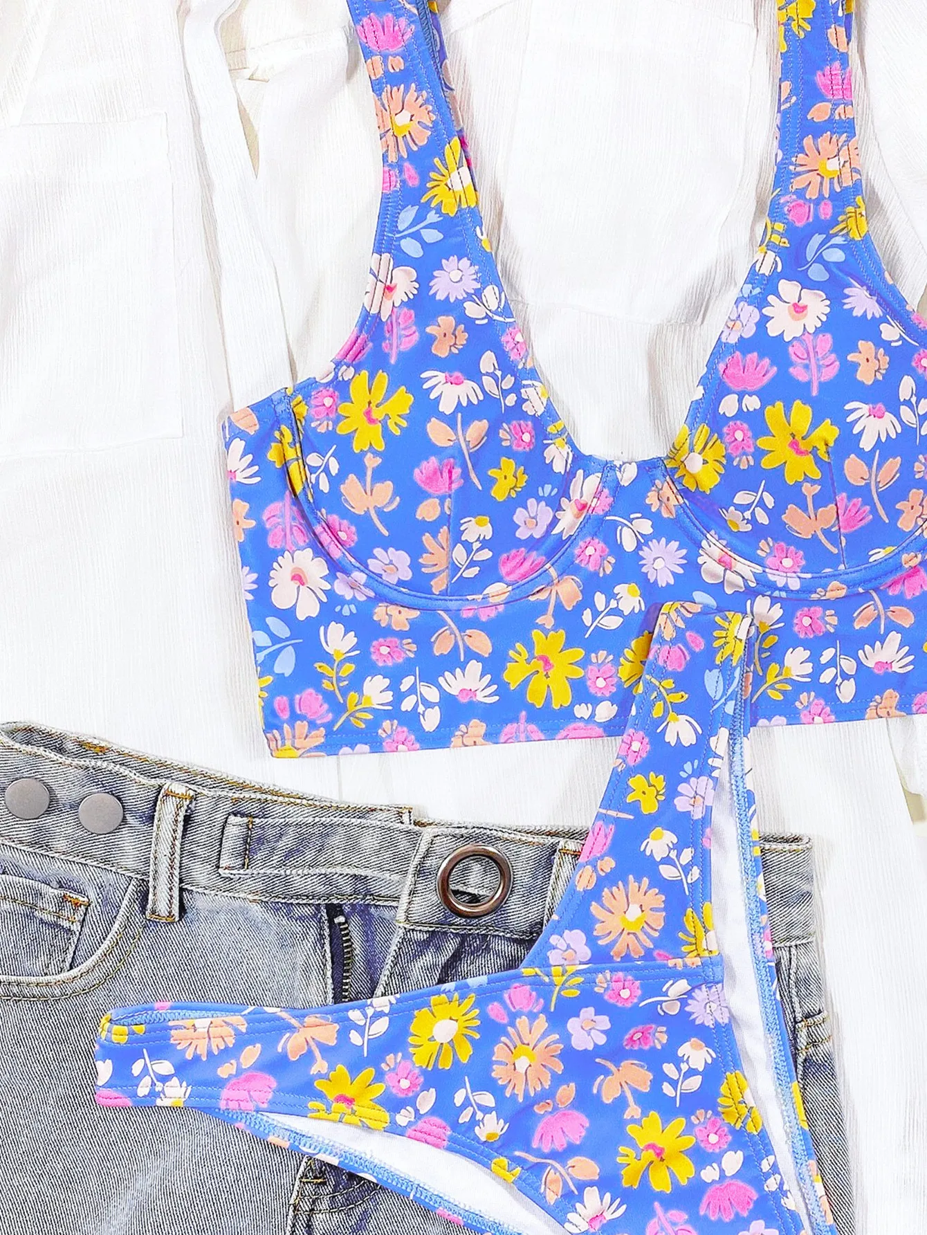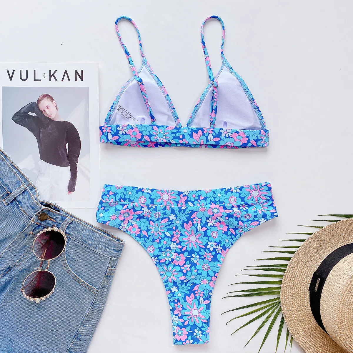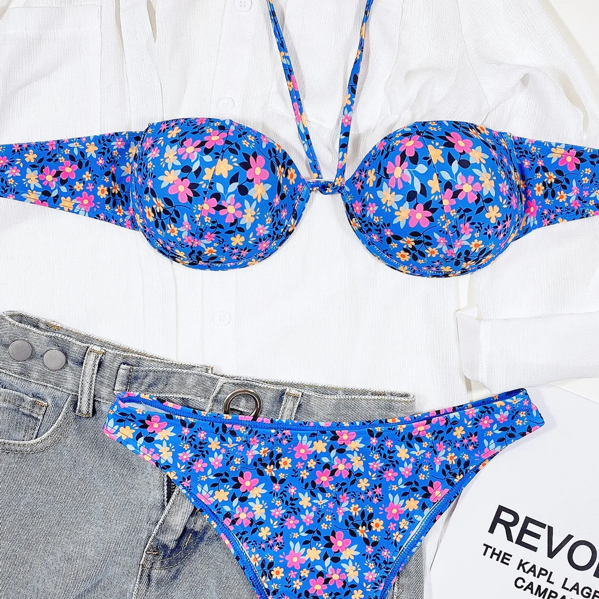Купальник-бикини пуш-ап с заниженной талией и цветочным принтом