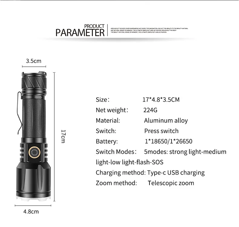 1. Оснащен лампами XHP199, ярче, чем фонарик XHP90/XHP70/XHP50/L2/T6/V62. Плавный режим затемнения, поворотная Кнопка затемнения3. Водонепроницаемый в соответствии с IP65, водонепроницаемый, может использоваться в дождливую погоду, но не может быть помещен в воду4. Широкое применение: охота, патруль, строительство, прогулки, дома, техническое обслуживание, поиск и спасение5. Прямая зарядка через USB Type C