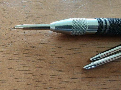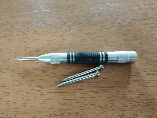 Подпружиненный боёк. Удобно намечать места вкручивания саморезов в деревянные элементы конструкций! Спасибо!