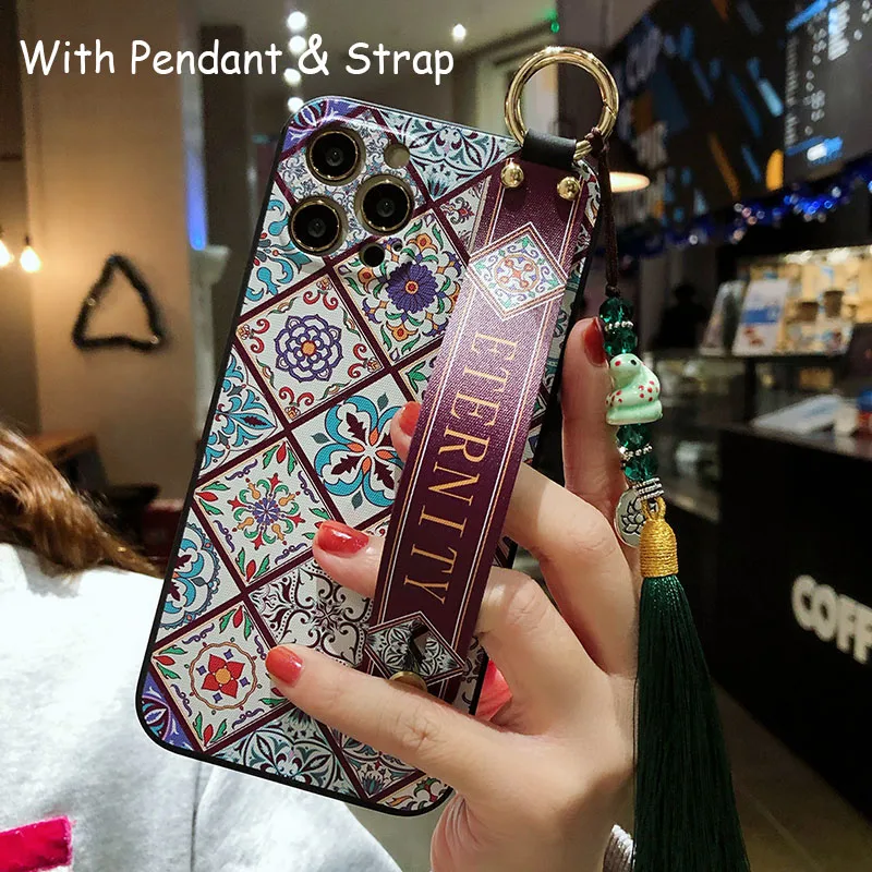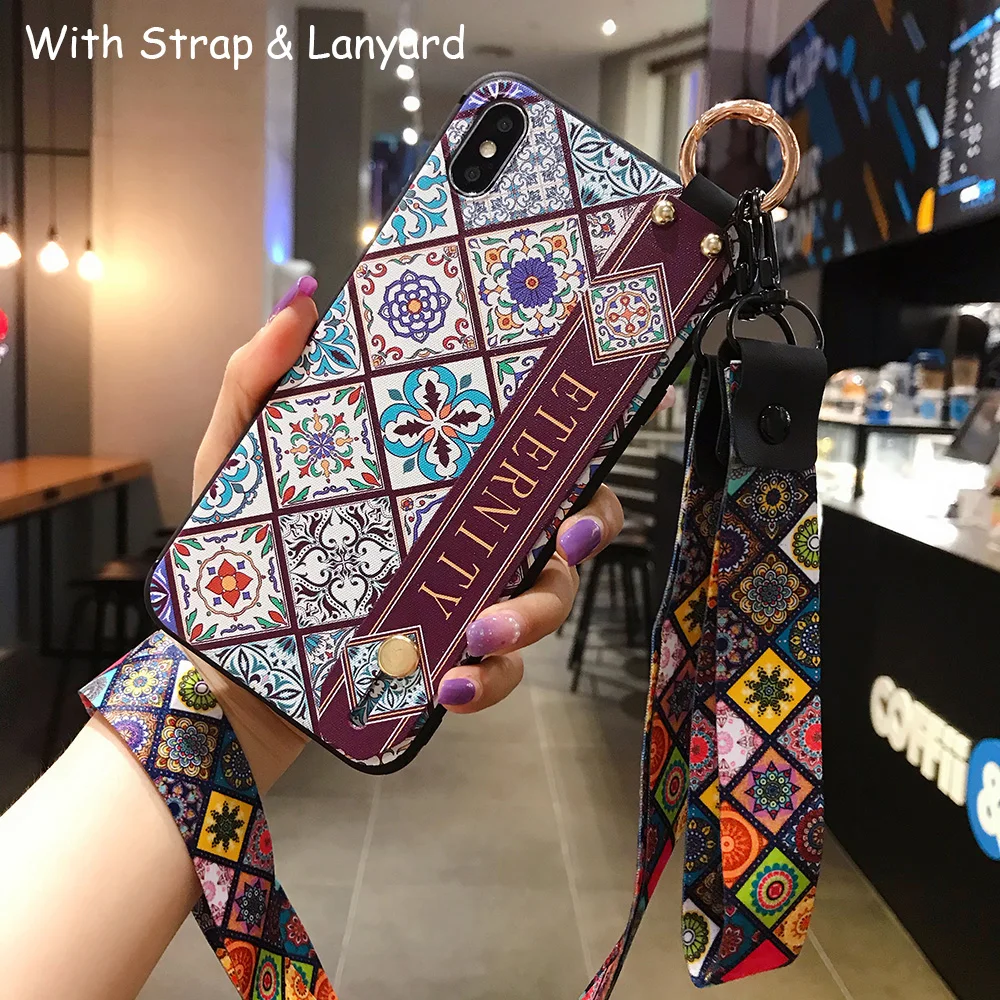 Модный Радужный градиентный ремешок на запястье, ремешок для телефона, чехол для iPhone 13 12 11 Pro Max Mini XS XR 8 7 Plus, этнический цветок, квадратный браслет, подставка, держатель, мягкий чехол, Coque Funda