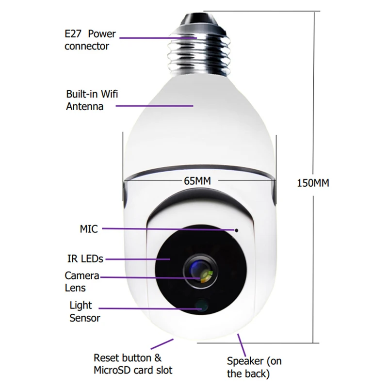 Лампочка E27, Wi-Fi, PTZ, инфракрасное ночное видение, двусторонняя...