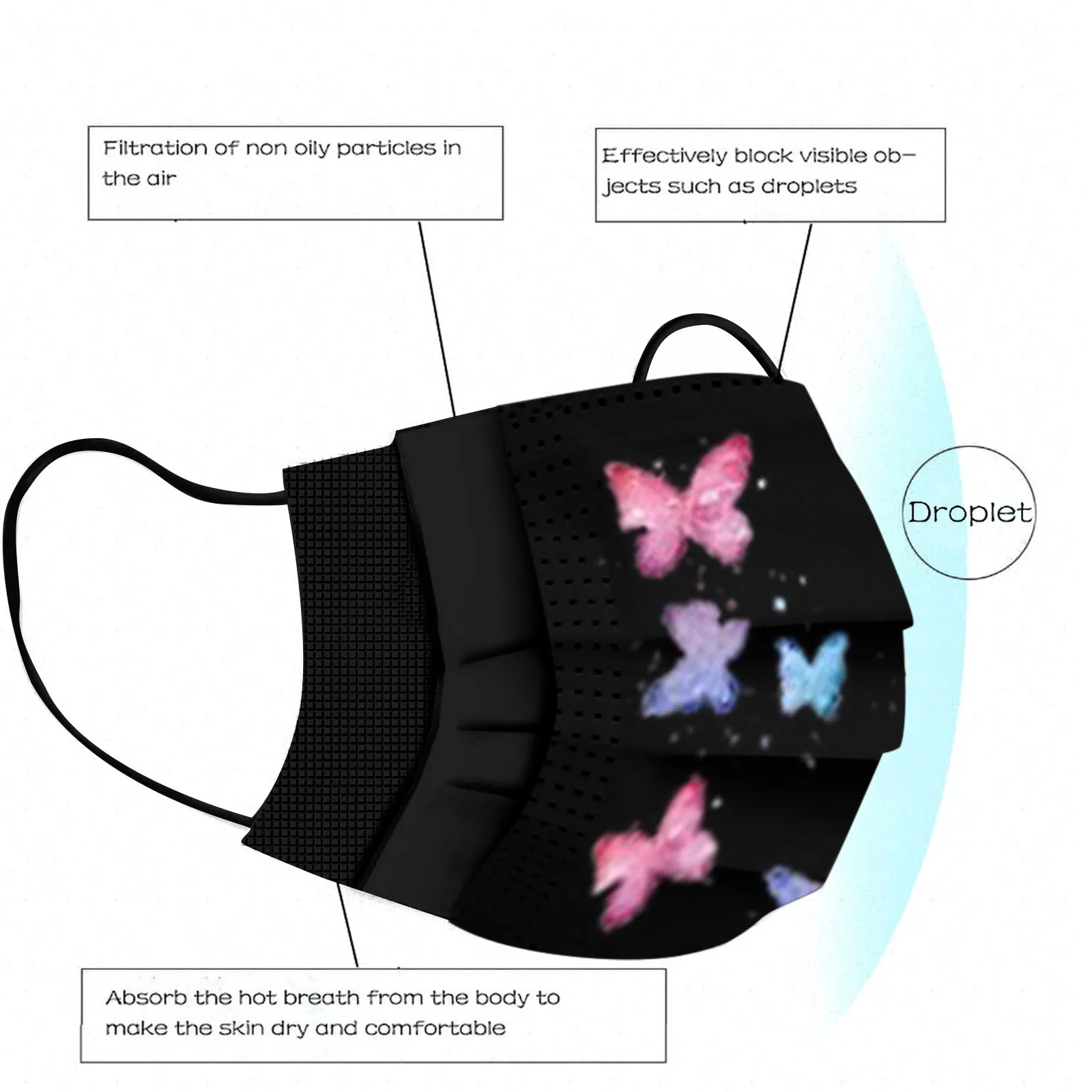 В 3 слоя Нетканая одноразовая маска изготовлена из 3 слоев нетканого материала, Безопасен и безопасен для использования. Дышащий материал и милый Узоры, которые делают его полезным и модным. Специальный 3 слоя из нетканого материала Дизайн, обеспечивает некоторую защиту от пыли, автомобильных выхлопных газов, Пыльца и т. д. эластичная Ушная петля, легко носить и не давит на уши. Маникюрный салон или любые другие области, где может потребоваться защита