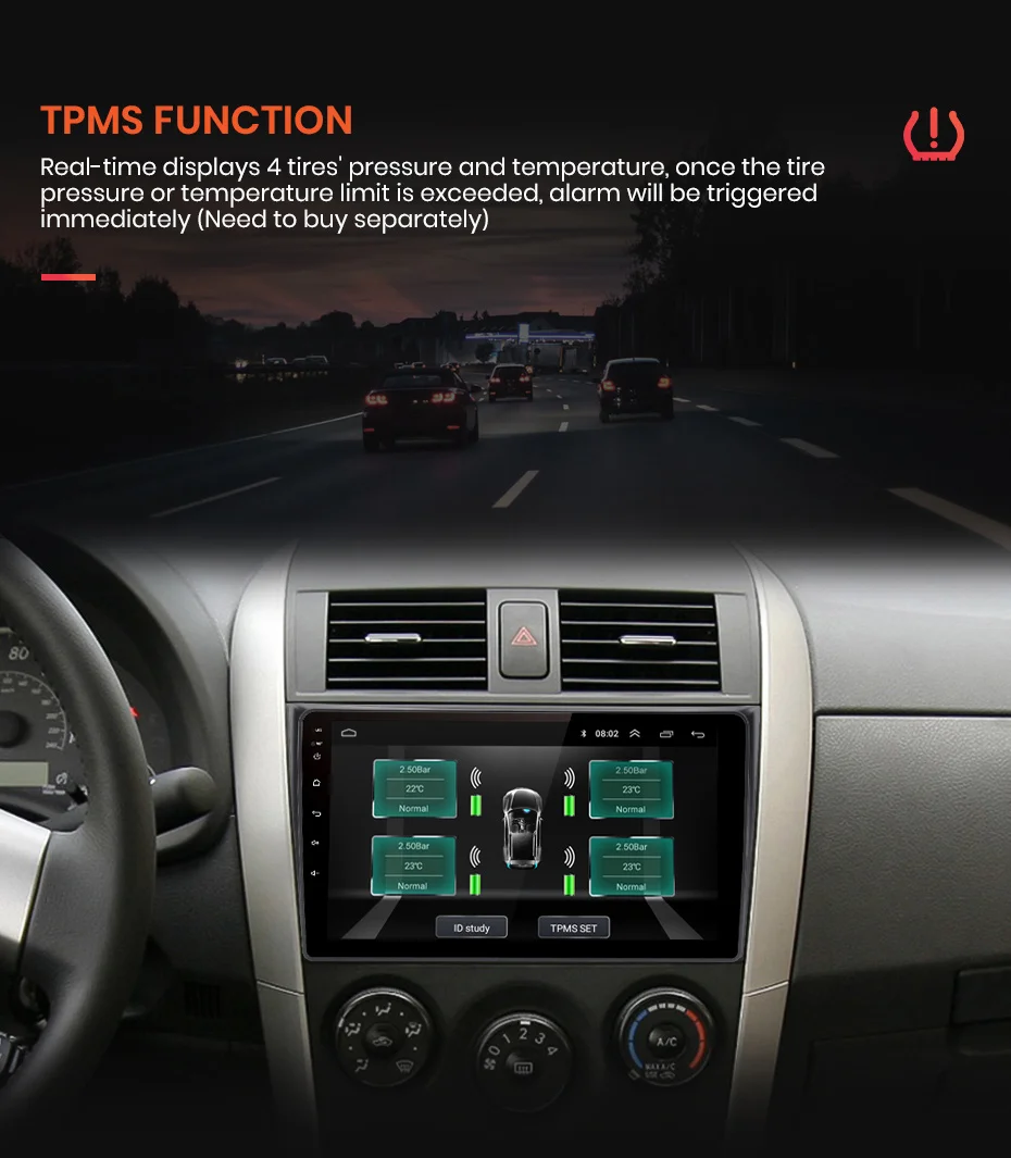 Отображает 4 давления и температуры в режиме реального времени. Как только давление или температура в шинах будут необычными, сразу же будет сигнал тревоги.