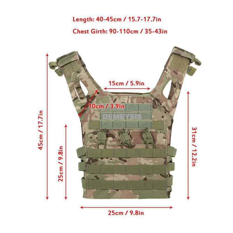 Описание:Изготовлен из высококачественного нейлонового материала, ноский и прочный, отлично подходит для пейнтбола, wargame или других видов активного отдыха на свежем воздухеДизайн наклеек спереди, легко надевать пластырьМОЛЛЕ как спереди, так и сзади для крепления большего количества мешков или других предметов3 x M4 чехлы на передней панелиРегулируемые лямки с подкладкойУпрощенная версия для удобной переноскиРазмер: (около 25 см x 31 см)Длина 40 см-45 смОбхват груди 90-110 см Примечание:В комплект жилета входит 2 шт. пенопластовая доска. И у нас все еще есть пенопластовая доска для продажи, вы можете заказать ее в качестве запасных частей. Посылка:1 х Тактический военный жилет