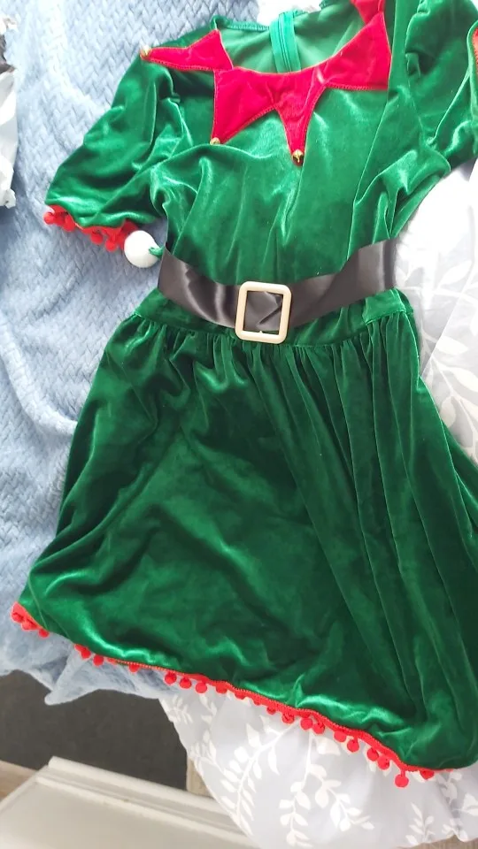 Особенности: Костюм изготовлен из бархатного материала, рекомендуется ручная стирка. Таблица размеров означает возраст для девочек, но только для общего руководства. Короткие пышные рукава; Дизайн с лацканами; Платье-пачка в стиле пэчворк с кисточками. 1 слой платья, красный подол. Подходящий пояс, шляпа, украшенная маленькими колокольчиками. Подходит для рождества, косплея, вечерние темы, ролевых игр, нарядов, фотографий, праздников и т. д.