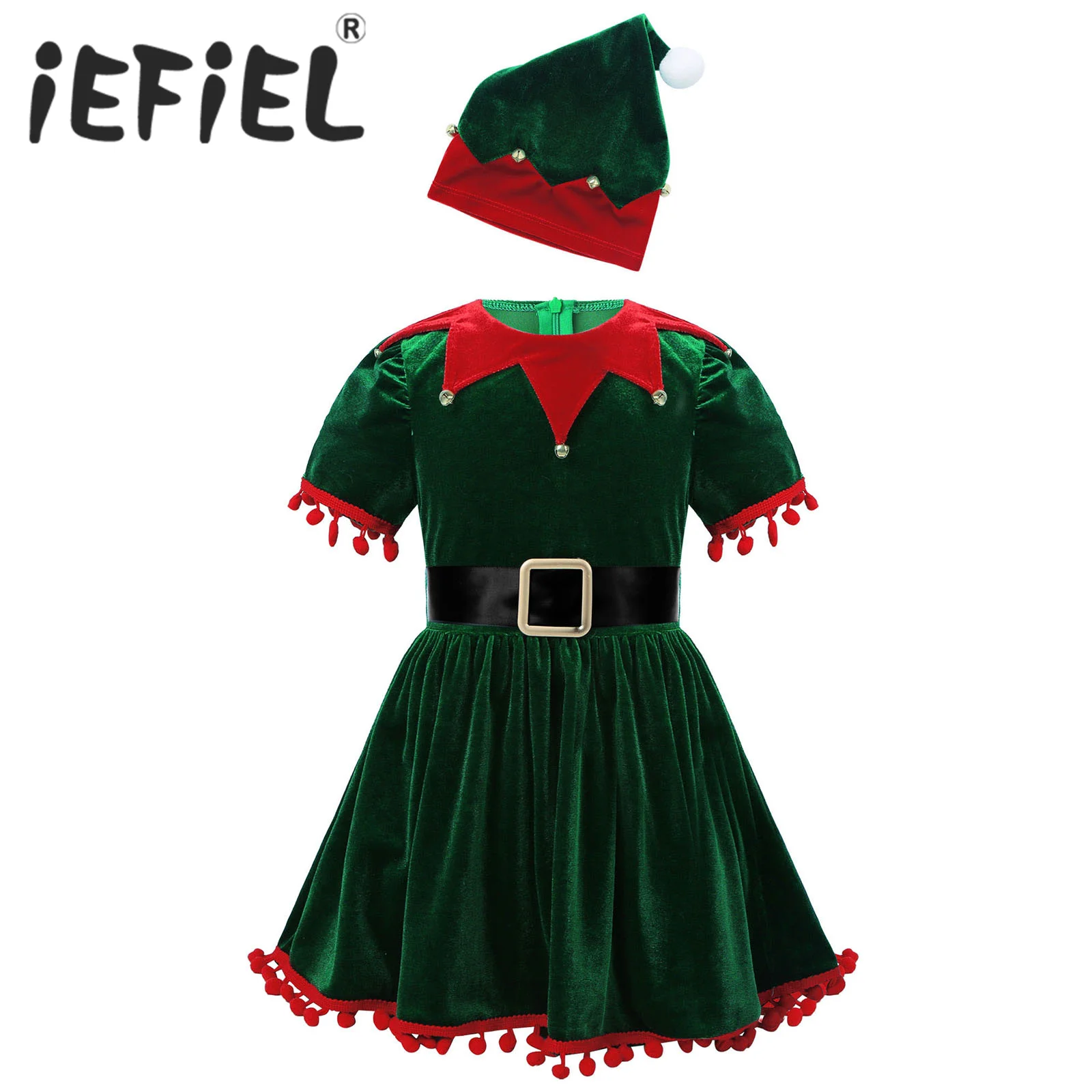 Детские Рождественские костюмы для девочек с изображением эльфа, деда мороза, рукава с оборками, лоскутное платье-пачка с бахромой и ремнем в виде шапки для необывечерние вечернего платья