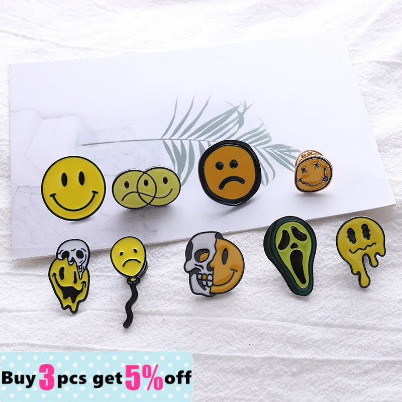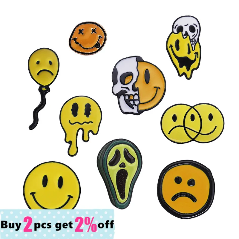 Эмалированная брошь из сплава с изображением смайлика, плача, череп...