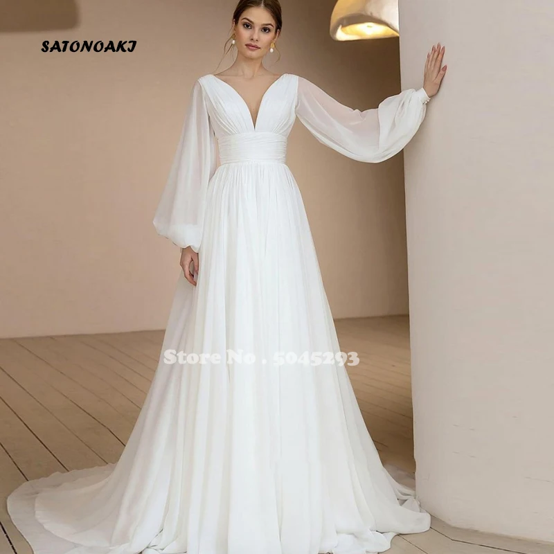 Свадебное платье-трапеция с V-образным вырезом и рукавами-фонарикам...