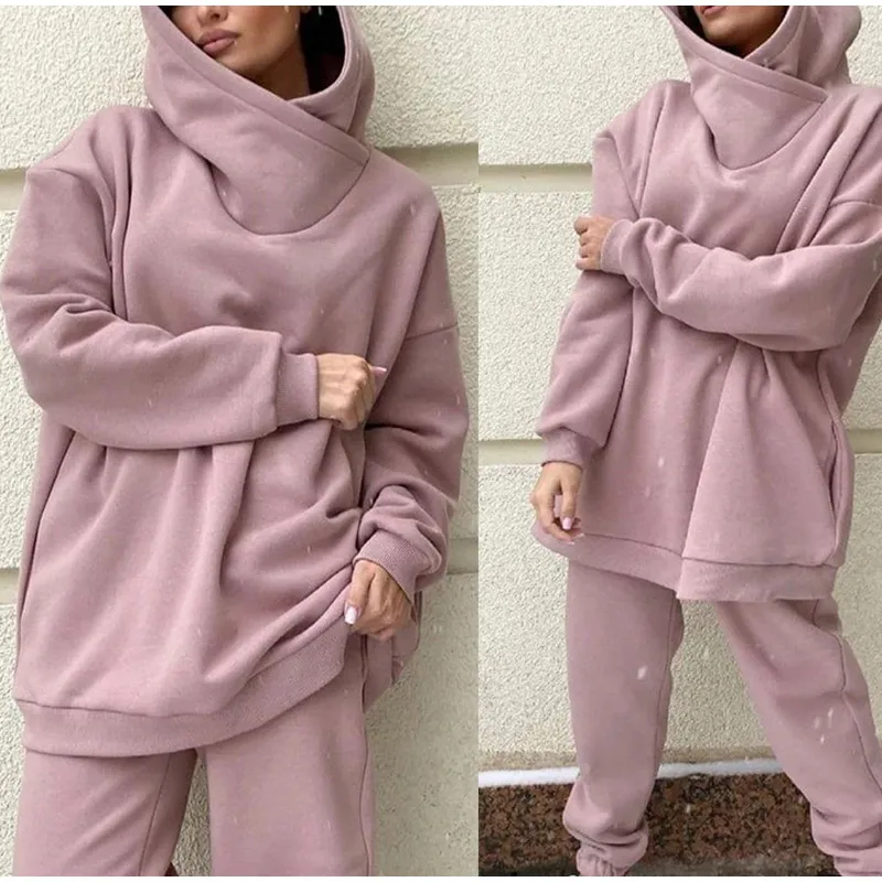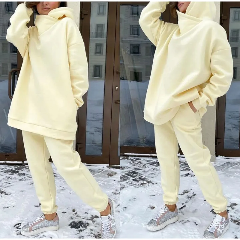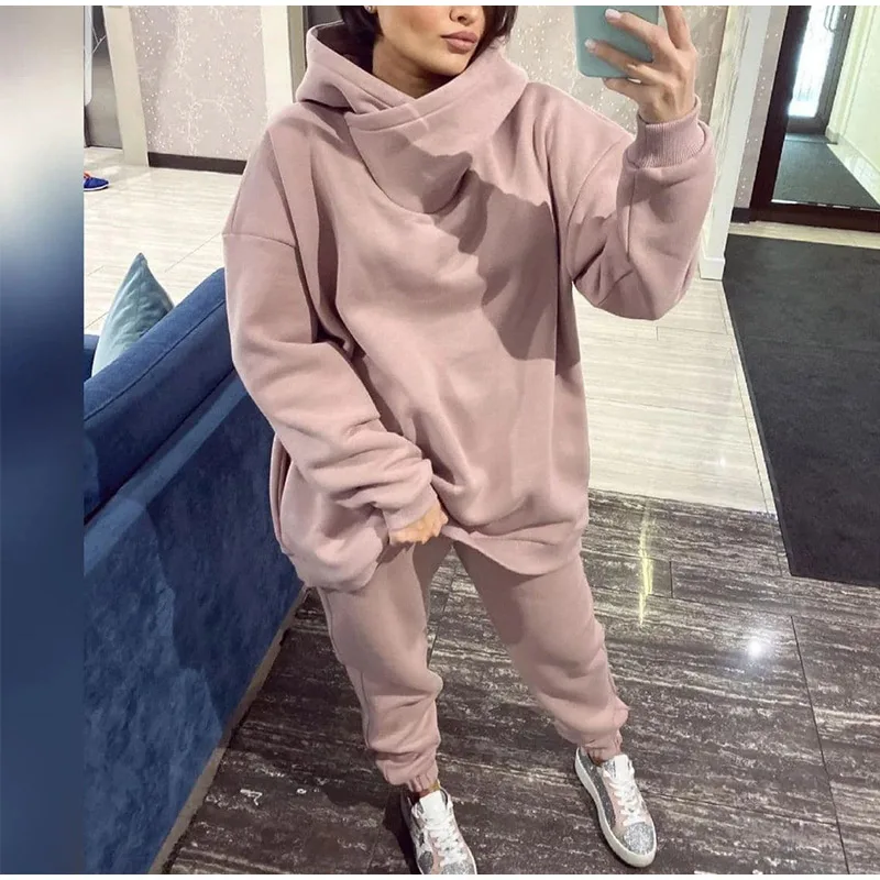 Повседневный женский осенне-зимний теплый спортивный костюм, комплект из двух предметов, Толстовка Оверсайз с капюшоном и штаны, спортивная одежда, однотонный комплект