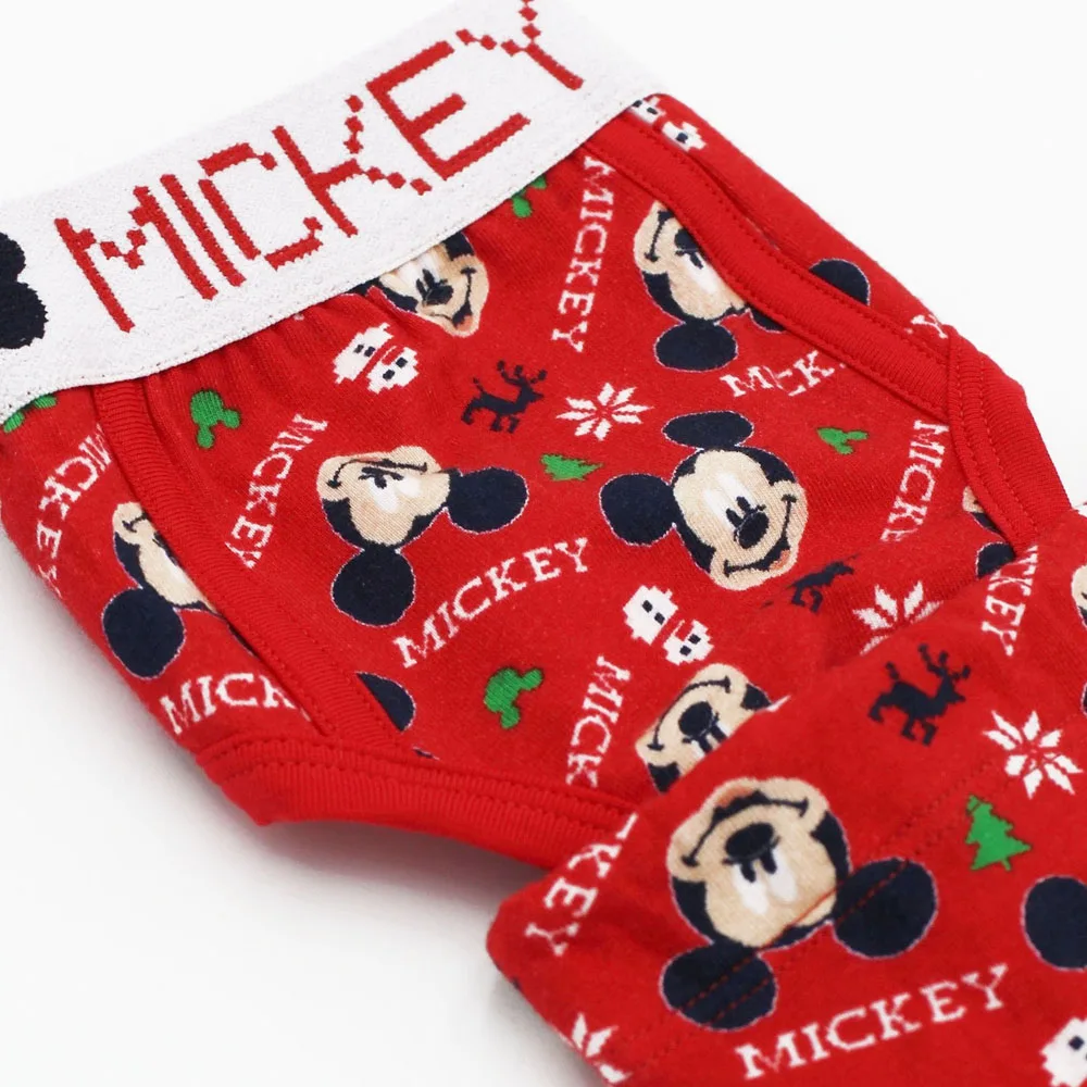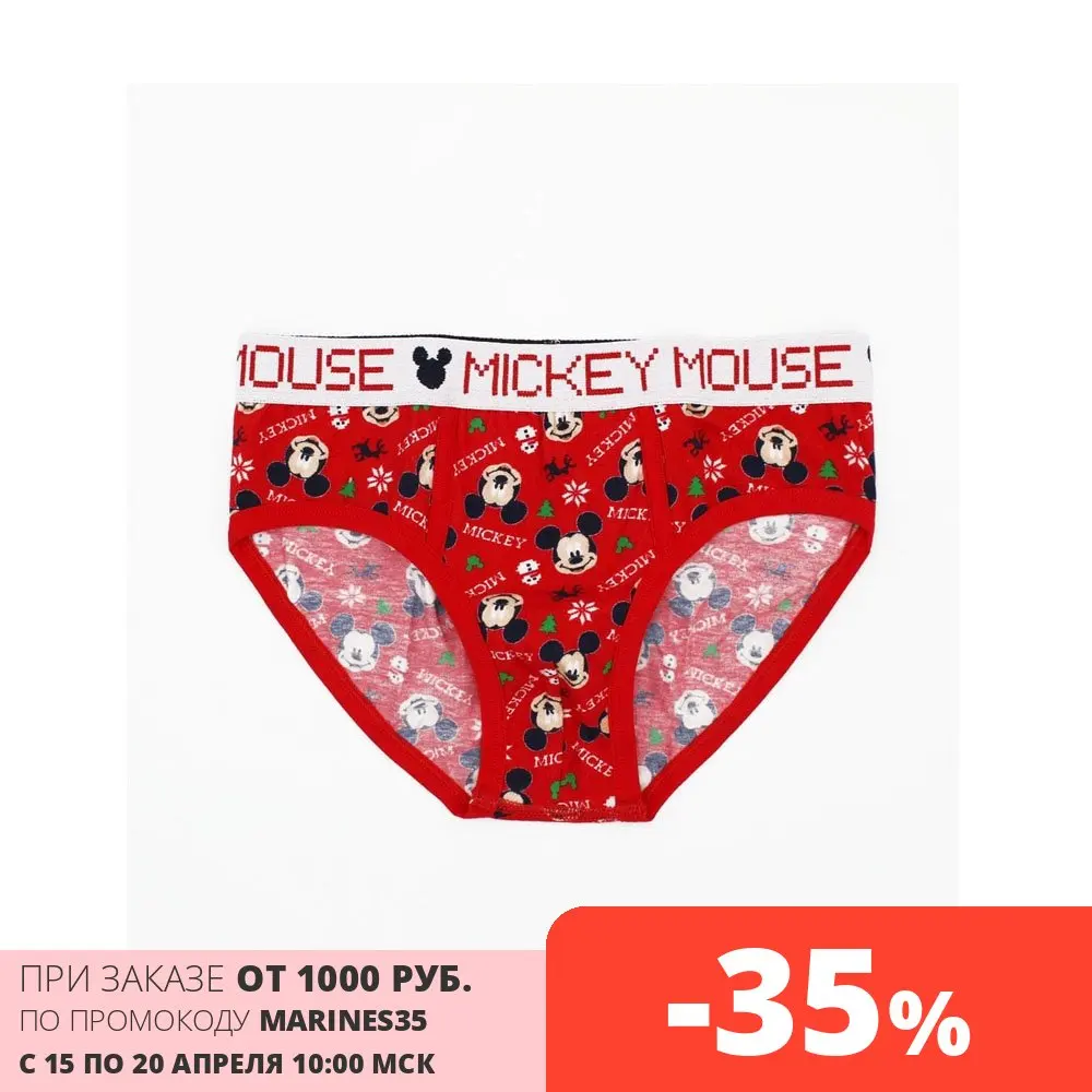 Трусы для мальчиков имеют новогоднюю, красную расцветку. Красная стрейч-резинка на поясе. Модель выполнена из натурального, дышащего материала - 95% хлопка, 5% эластана. Хорошо тянется, принимает форму по телу. Расцветка орнамент с изображением Микки Мауса.
