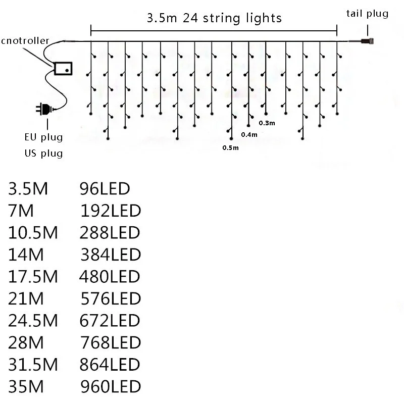 Постоянно контроллер яркости имеет только один режим-устойчивый, водонепроницаемый IP65, подходит для использования на открытом воздухе.Пожалуйста, имейте в виду, что в 8 режимов контроллер Водонепроницаемый IP44, пожалуйста, храните в недоступном для детей месте.Параметры● Наименование товара: светодиодный светильник для рождественской занавески.● Технические параметры: 3,5 м X 0,3 м/0,4 м/0,5 м 96 светодиодов,● Материал: ПП, ТПР и CR-V сталь.● Водонепроницаемость: IP65.● Светодиодный цвет: синий/белый/Разноцветный/теплый белый● Источник питания: штепсельная вилка европейского стандарта● Сертификация: CE & RoHS.Особенности● Сосулька светильник s не пропускает воду и спроектирована таким образом, чтобы выдерживать светильник погоду или в любой другой вода разлива, что делает его идеальным для наружного декора.● Светильник-это ряд светодиодов, которые очень хорошо рассеивают светильник и обеспечивают мощный, но даже светильник без резких Бликов или теней.● Различные размеры и светодиодный индикатор могут удовлетворить ваши потребности в украшении. Рождественские елки, вечерние, свадебные, для дома, сада, окна, ванной комнаты, балкона, праздника, шоу, ресторана, отеля, коммерческого здания, торгового центра, магазина, паба, клуба, концерта, зал, кабаре, модное шоу, танец, сцена и т. Д.● Безопасная штепсельная Вилка для мужчин и женщин в комплекте, водонепроницаемая для внутреннего и наружного декора.Посылка включает в себя● 1 X светодиодный светильник для рождественской занавески.● Адаптер-1 шт.