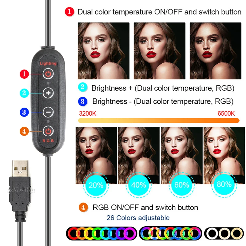 Тип 4,33 см RGB кольцевой светильник:А. 10 режимов яркости.B.3 цвета, плавный затемняющий светильник, белый светильник, теплый светильник, мягкий светильникС. В студии, чтобы заполнить светильник фото, портрет автоспуска заполняющий светильник.D .. фотостудия кольцевой светодиодный светильник Usb заглушка заполняющий светильник.E. Подходит для многих социальных, таких как создание, видео в режиме реального времени, студийный светильник, фотография.F. Режим симфонии: 13 динамических, 13 статических, 26 режимов в общей сложности G:Спецификация:Внешний диаметр: 33 смВнутренний диаметр: 25 смЦветовая температура/Теплый светильник: 2800-3200KЦветовая температура/белый светильник: 4800-5200KКоличество лампочек: 168 бусинCRI: 80Режим питания: интерфейс USBНапряжение: 3,7-5,0 VСветильник Мощность: 11 ВтЛюмен: 800 лмМатериал: АБС-пластикДлина кабеля USB: 2 мПримечание:1. Примечание: usb-порт для зарядки требует 5 В/2A питания или использовать QC 3,0 зарядный разъем. В противном случае это повлияет на функцию продукта.