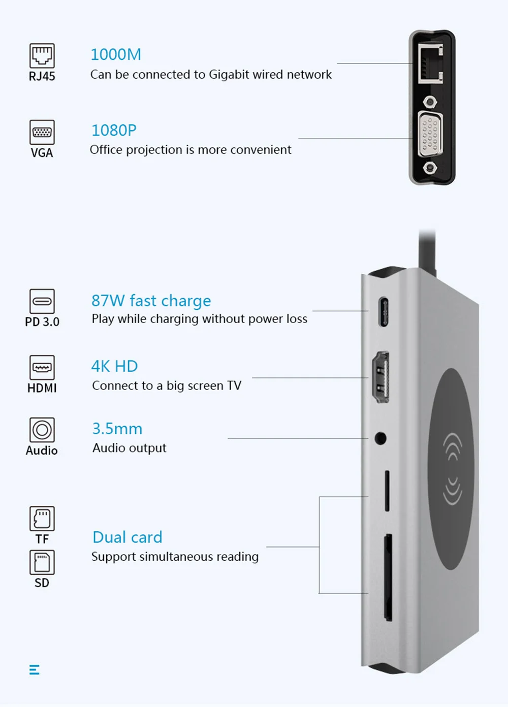Feature 1USB-C to HDMI/Card reader/RJ45/PD Adapter/Wireless charging
