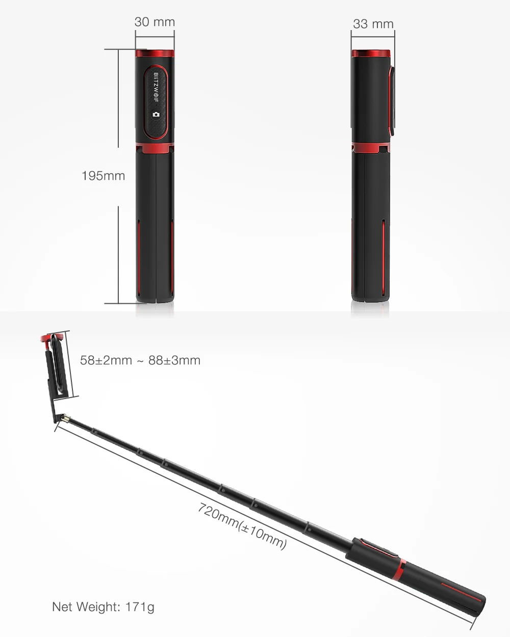 Модель BW-BS10Версия bluetooth V3.0Пройденное расстояние ≤ 10 мРазмеры 33*30*195 ммРастягивается длина 720 мм (± 10 мм)Диапазон зажима для телефона 58 ± 2 мм-88 ± 3 ммВес нетто 171 гЕмкость аккумулятора 50 мАчДистанционный Срок службы батареи 20000 + последовательные фотографииЗарядное напряжение 5 ВЗарядный ток 0,5-2AСовместимость для мобильных телефонов с системой Android 5,0 + или IOS7.0 + (Примечание: не поддерживает ios 13,4 или выше)Рабочая температура-10 ℃-50 ℃Сертификаты FCC, RoHS, CE