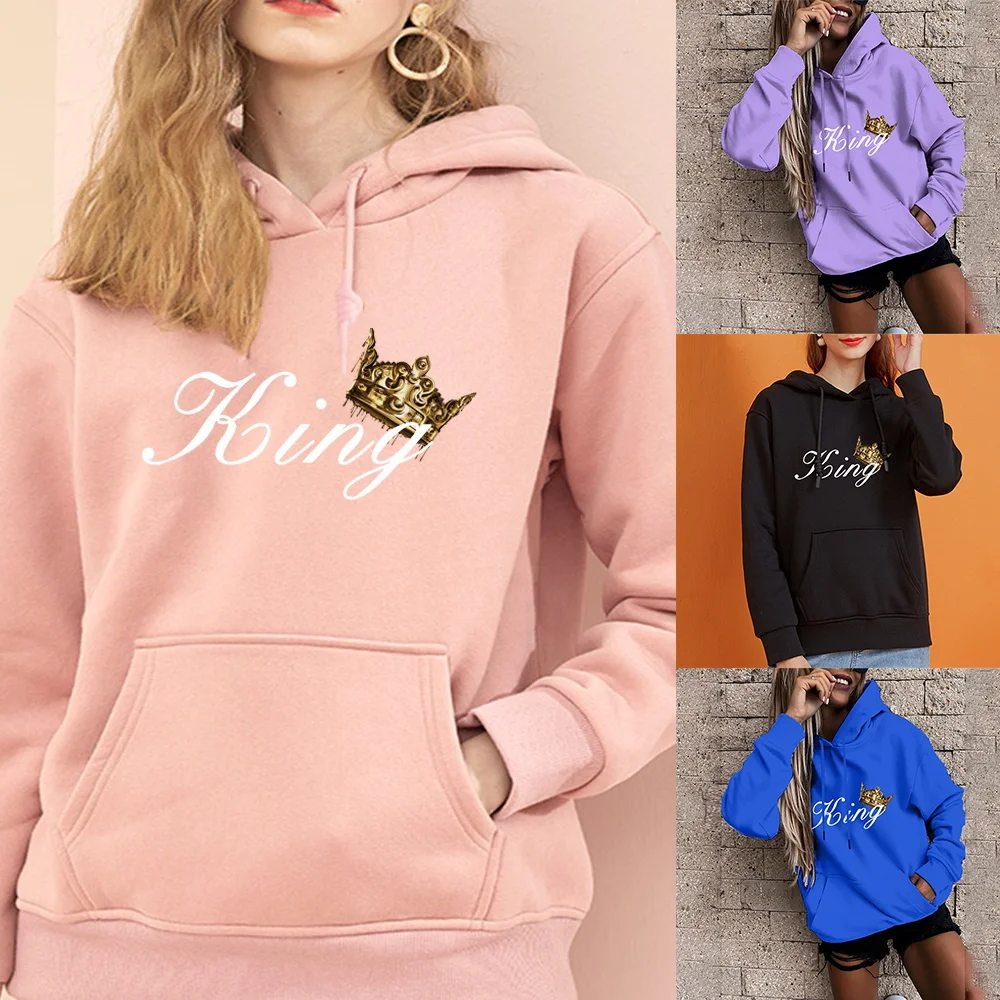 Модные женские толстовки в стиле Харадзюку, свободный спортивный пуловер с большими карманами и длинным рукавом, повседневный пуловер с капюшоном для девочек и с принтом короны
