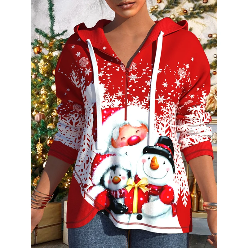 Женская толстовка с капюшоном и длинным рукавом, с рождественским принтом, Свободный Повседневный пуловер средней длины на молнии, топы, весенне-Осенняя мода, 2021