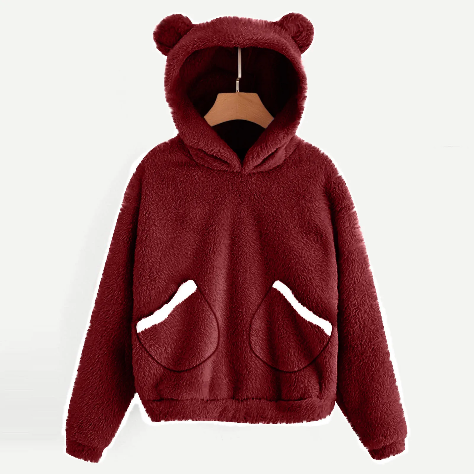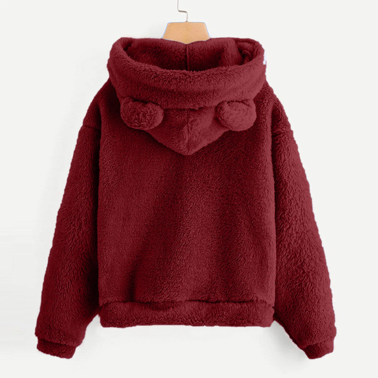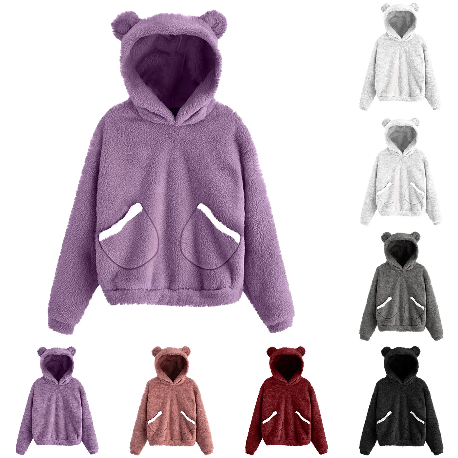 Женская флисовая толстовка с длинным рукавом, теплый Пушистый пуловер с капюшоном в форме медведя и карманом