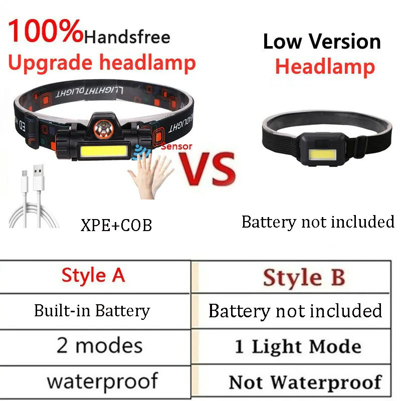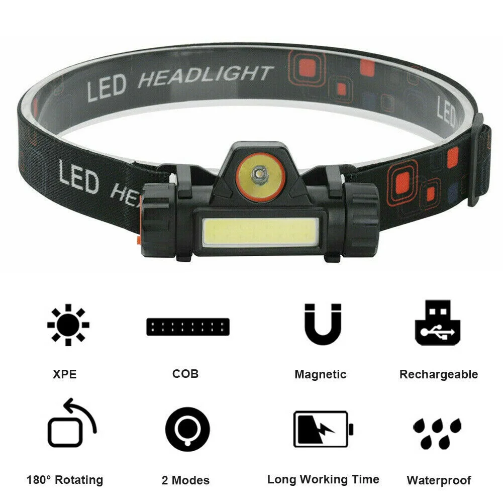 Светодиодный налобный фонарь XPE + COB, 2 режима освещения со встроенным литий-ионным аккумулятором 18650
