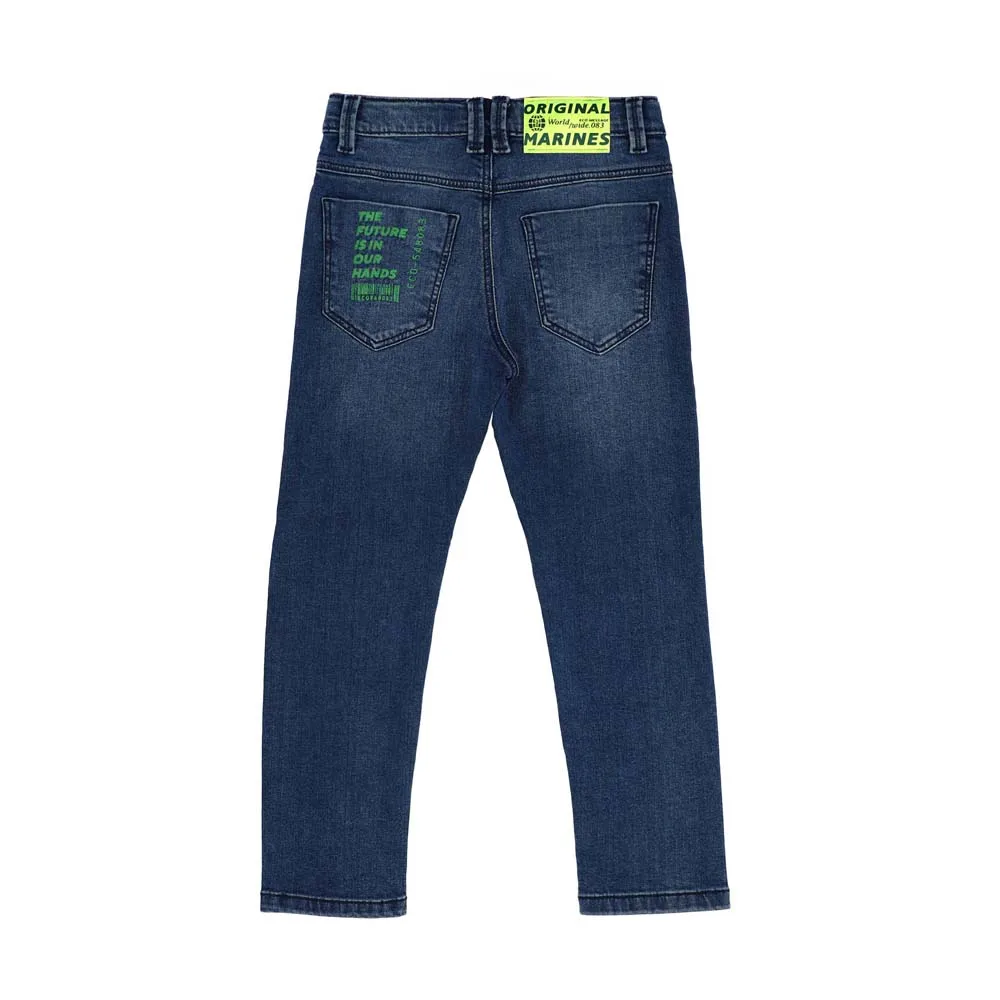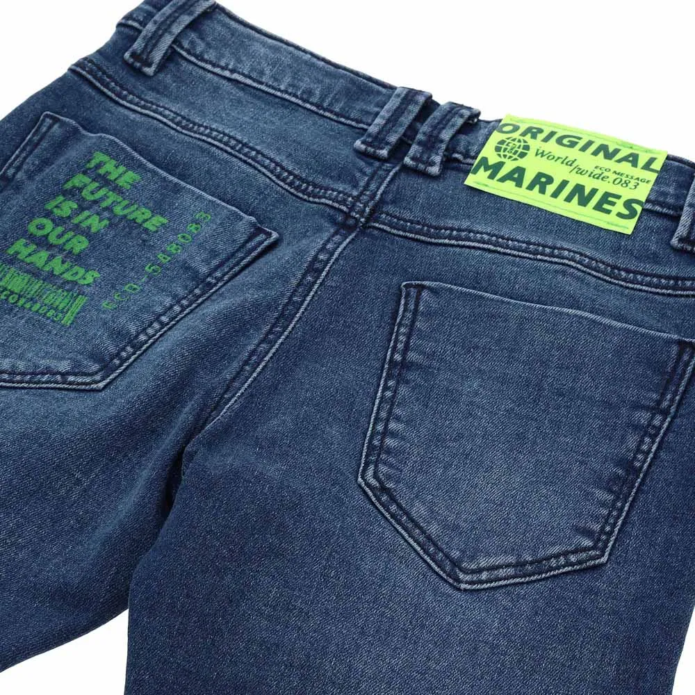 Джинсы для мальчиков красивого темно-голубого оттенка. Верхняя часть штанин слегка выбелена. Имеет среднюю посадку. Нашивки цифры и буквы неонового цвета - это яркий акцент. Ткань приятная, не требует специального ухода - 99% хлопка, 1% эластана. Модель включает множество функциональных карманов. Крой сложный имеет различные выкройки.