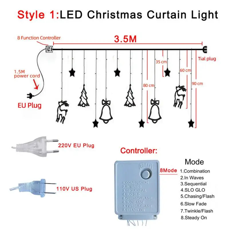 Светодиодная лампа-занавеска, Рождественская гирлянда для ЕС, США, ...