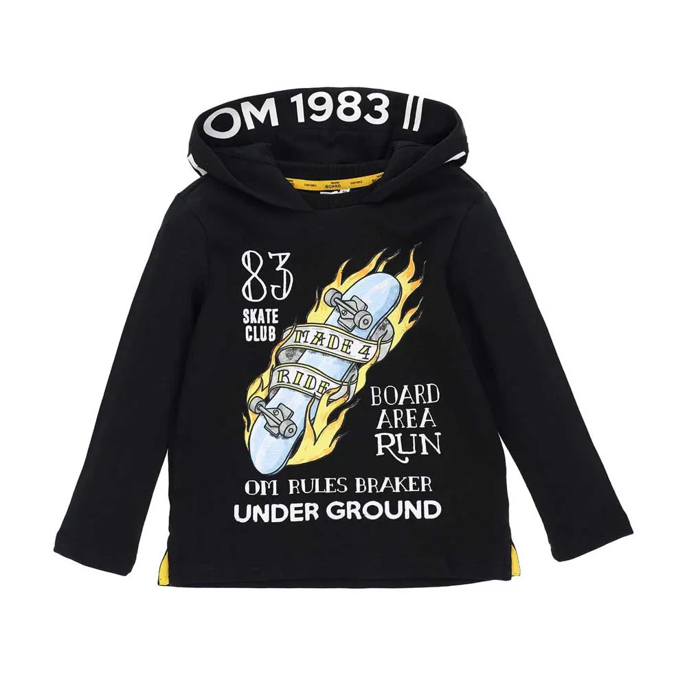 Толстовка для мальчиков отличается стильным принтом - скейтборд с яркими акцентами. Ткань эластичная, но мягкая. Оверсайз определяет свободу фасона. Рукава со стрейч резинкой. Дополнительных застежек не предусмотрено. Отличается глубоким, однотонным капюшоном.